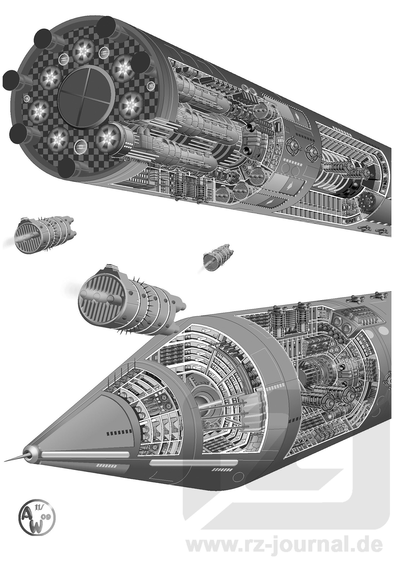 Ihre Raumschiffe sind standardmäßig raketenähnlich, das heißt, sie sind am Bug spitz und am Heck flach abgeschnitten. Dargestellt ist ein Kriegsschiff mittlerer Größe, ein Schlachtkreuzer. Standardkreuzer sind halb so lang und haben den halben Walzendurchmesser, Standardschlachtschiffe haben die doppelte Länge und den doppelten Durchmesser.