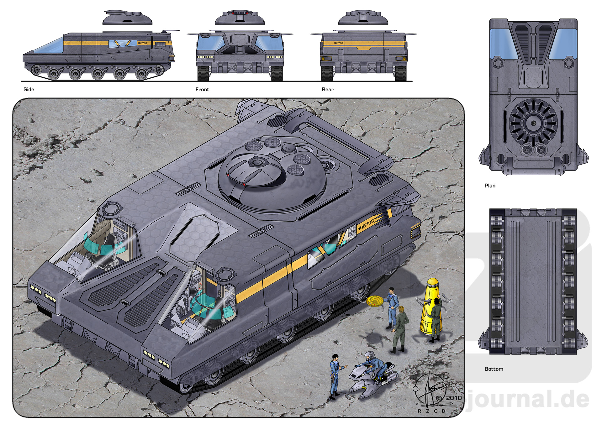 Das Bild zeigt die Standard-Konfiguration des Shifts Typ LUPUS mit Gleiskettenchassis, Doppelcockpit und Einsatzmodul mit leichtem Geschützturm. Die Grundform des Shifts basiert auf dem bewährten Konzept des Scorpio-Shifts, der sehr lange das bevorzugte Modell auf vielen Raumschiffen war.
