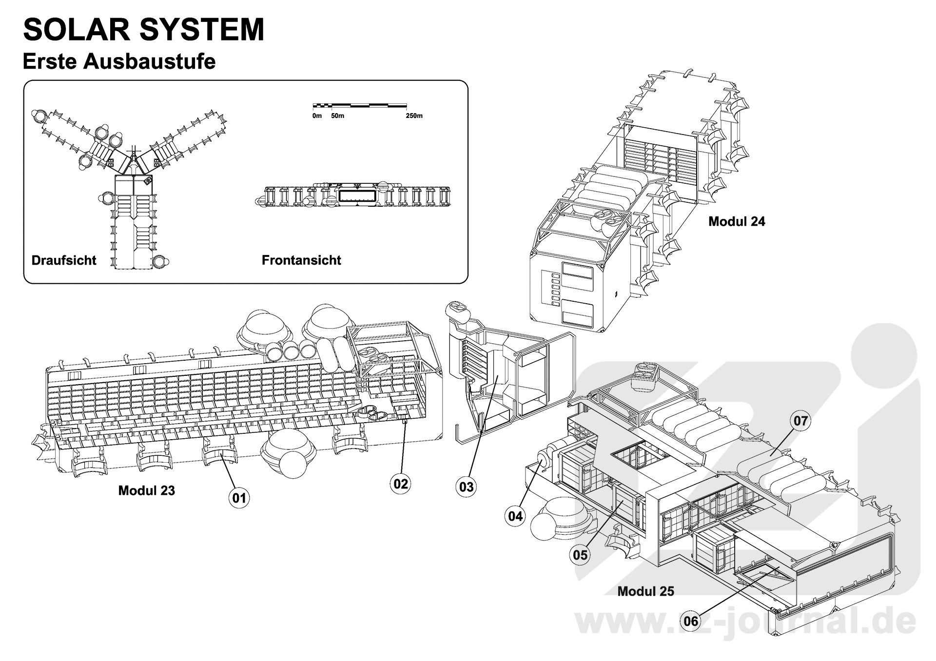 Legende: 01 externe Andockvorrichtung für Schiffe der SKARABÄUS-Klasse (gesamt 64 Stück) 02 Mannschleuse 03 Kopplungsmodul mit Verbindungsgängen, wird dem Modul 25 zugerechnet 04 Maschinenkern mit zwei Fusionsreaktoren, Lebenserhaltung, Gravitationskontrolle etc. 05 Frachtbereich, Kapazität 16 Bundles zu je 16 Container SC1 (5 x 5 x 25 m) 06 Zugangsschleuse zum Frachtbereich, auch als interner Hangar nutzbar 07 Atmosphärendruck- und Kernbrennstofftanks