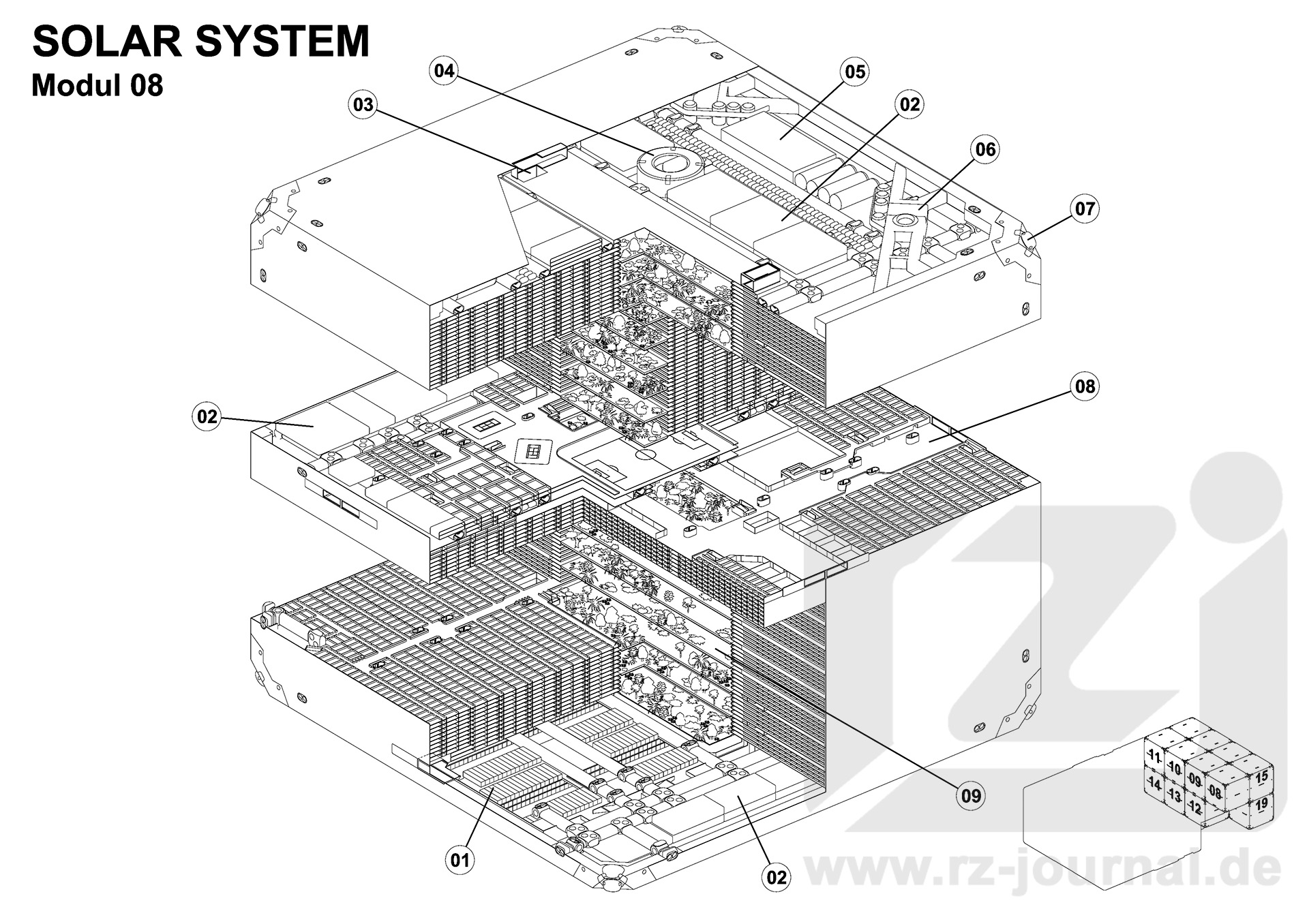 Die Würfelmodule des ARCHEN-Typs II mit den Bezeichnungen 08 bis 22 sind abweichend von der Standard-ARCHE für den Dauereinsatz im Weltraum konzipiert und deshalb mit eigenem Basisrahmen sowie internen Transport- und Verkehrswegen ausgestattet. In beiden Fällen haben die Würfel 500 Meter Kantenlänge. Neunzehn Hauptdecks mit sechs Etagen je Hauptdeck stellen pro Modul 166.586 Standardwohneinheiten zur Verfügung. Verwaltungen, medizinische Einrichtungen, Sport- und Freizeitangebote konzentrieren sich auf das Hauptdeck 11. Eine 55 x 236 Meter große Kernstruktur in der Art eines Atriums wurde auf allen Hauptdecks für Parkanlagen vorgesehen, die von den Bewohnern der Station genutzt werden können. Die Supportebenen 01 und 21 beinhalten ein Containerversorgungsdeck mit maximal 1156 SC1-Containern. Hinzu kommen Kraftwerke, Wartungsdepots für Transportkapseln, Abfallrecycling und dergleichen. Die Lebenserhaltungssysteme und Hydroponiken zur Nahrungsmittelversorgung befinden sich auf den Ebenen 01 und 21 sowie auf Hauptdeck 11. SOLAR SYSTEM hat eine Standardkapazität von 7,5 Millionen Bewohnern, die Aufnahmegrenze bei Notunterbringung und Volllast der Lebenserhaltungssysteme liegt bei zusätzlichen 12,5 Millionen Personen. Anfang 1463 NGZ befinden sich als Besatzung noch rund 800.000 Personen an Bord. |