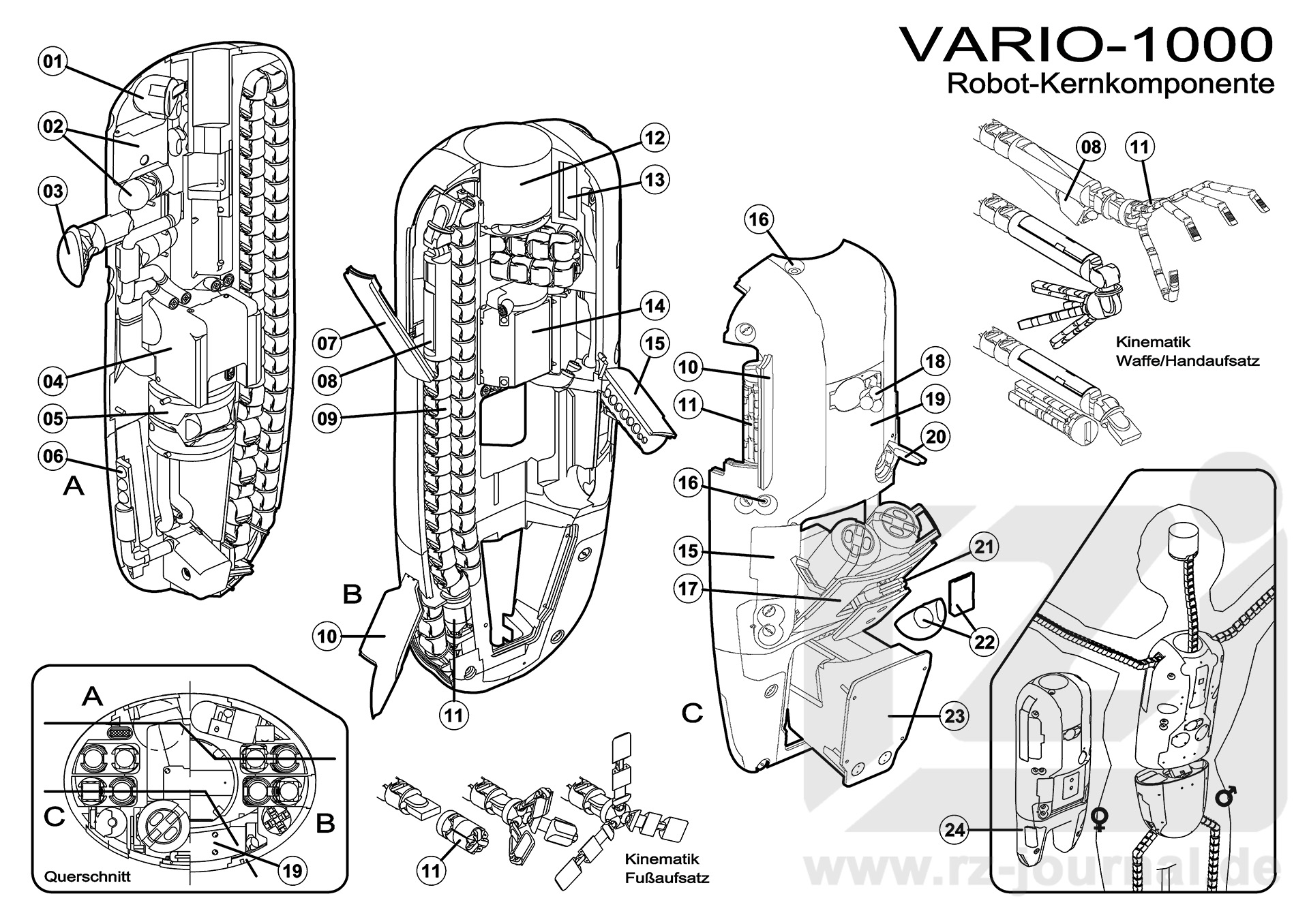 Allgemeines: Die biopositronischen »Roboter« der VARIO-1000-Serie basieren weitgehend auf ihrem Vorgängermodell VARIO-500, sind jedoch an die Bedingungen der erhöhten Hyperimpedanz angepasst. In sie sind die mit diversen »Sonderbauten« der Posbis gemachten Erfahrungen eingeflossen. Vor allem eine charakteristische UHF-Bestrahlung des Zellplasmas hat diesen Qualitätssprung begünstigt. Die VARIO-1000 wurden gemeinsam von USO und TLD entwickelt und in Quinto-Center fertiggestellt. Ursprünglich war daran gedacht, sie als Infiltrationseinheiten bei der Terminalen Kolonne TRAITOR einzusetzen – in tarnenden Kokonmasken von Mor’Daer oder Ganschkaren. Das Risiko, dass ihre wahre Natur aufgedeckt werden könnte, wurde jedoch als zu hoch bewertet. Zum Einsatz kamen die drei VARIO-1000 im Stardust-System: Sie erreichten Aveda am 9. November 1346 NGZ, kurz bevor die Teletrans-Weiche nach der 88-Tage-Frist am 13. November um 22.39 Uhr Terrania-Standardzeit den Betrieb einstellte. An diesem Stichtag waren rund 804 Millionen Menschen vom Sol- ins Stardust-System gewechselt. Der zweiteilige, grob ellipsoide Grundkörper hat mit eingezogenen Extremitäten eine Höhe von 498,5 mm sowie einen größten elliptischen Querschnitt von 200,0 x 141,9 mm. Die vakuumgeschäumte Ynkon-SAC-Panzerung hat eine mittlere Dicke von 6 mm, die Masse des Grundkörpers beträgt in der Standardkonfiguration 51,2 kg. Als Infiltrationseinheit verbirgt sich der Roboter in der Regel in einer pseudovariablen Kokonmaske (PVK-Maske), die äußerlich von einem Menschen nicht zu unterscheiden ist. Der Zugang erfolgt über eine Öffnung im Brustkorb, innerhalb der Maske fährt der VARIO den Ortungskopf sowie die tentakelförmigen Extremitäten aus und dockt an die entsprechenden Implantate der Maske an. Grundsätzlich ist ein VARIO auch »unverhüllt« uneingeschränkt einsatzfähig. Für einen solchen »Nackteinsatz« werden im Grundkörper zwei viergliedrige Handaufsätze und zwei dreigliedrige Fußaufsätze mitgeführt, die zusammengefaltet nur ein kleines Volumen beanspruchen. Im feldenergetischen Betrieb kann die Kraftentfaltung mit der eines Haluters verglichen werden; die Lauf-Höchstgeschwindigkeit beträgt 100 km/h, die maximale Fluggeschwindigkeit beim Einsatz des Gravo-Paks wie bei einem SERUN ca. 500 km/h. |