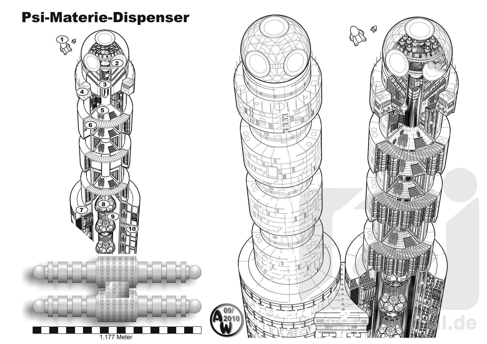Allgemeines: Bei der Erkundung von TALIN ANTHURESTA wurden innerhalb der Sonnentarnung des Handelssterns zwei brodelnde Nebelwolken entdeckt. Sie umkreisen diesen Kern wie Kleinplaneten oder Monde in rund 300.000 Kilometern Entfernung, sind voneinander etwa 3600 Kilometer entfernt und erreichen einen Durchmesser von zirka 150 Kilometern. Bei dem »Brodeln« handelt es sich um Psi-Materie – in jeder »Nebelwolke« ist eine Masse von etlichen Tonnen konzentriert, doch wegen der ständigen Fluktuationen ist dieser Wert nicht konstant. Ein starkes Strahlungsfeld im UHF- und SHF-Bereich des hyperenergetischen Spektrums umgibt weiträumig die Nebelwolken. Auch in diesem Bereich von rund 400.000 bis 500.000 Kilometern Durchmesser kommt es zu Fluktuationen von Psi-Materie, doch ist hier die »Partikeldichte« ungleich geringer. Ein Großteil liegt nicht in festkristallisierter, sondern eher gasförmiger Struktur mit winzigsten instabilen Partikeln vor. Verbunden damit ist ein intensiver Psi-Sturm. In beiden Nebelwolken gibt es festmaterielle Gebilde, sogenannte Psi-Materie-Dispenser. Ein Dispenser ist eine Ausgabevorrichtung im weitesten Sinn – für manuelle, halbautomatische oder vollautomatische Verteilung/Ausgabe – und reicht somit z.B. vom primitiven Verkaufsständer über Medikamentenausgabebehälter, Verkaufsautomaten bis zu Dosierpumpen etc. Die Psi-Materie-Dispenser sind von gelblich-goldfarben flimmernden Energieschirmen von rund zehn Kilometern Durchmesser umgeben. Jede goldene Doppelsäule besteht aus zylindrischen Elementen bzw. Segmenten und läuft an den vier Enden in angeflanschten Kugeln aus. Die Gesamtlänge beträgt 1177 Meter, die Kugeln durchmessen 114 Meter. Entlang einer 81 Meter durchmessenden inneren Hauptsäule sind Ringscheiben angeordnet, hinzu kommt der Mittelwulstzylinder mit 297 Metern Höhe und einem Durchmesser von 266 Metern, der mit dem Gegenstück der zweiten Säule gekoppelt ist. Die Dispenser-Stationen haben keine Besatzung; lediglich im Bereich des Kontrollraums und seiner engeren Umgebung können sich Lebewesen aufhalten. Das Gros der Psi-Materie-Dispenser ist unzugänglich. Ursprüngliche Aufgabe war die Herstellung von Psi-Materie aus dem natürlichen Psionischen Netz sowie deren Verteilung zur Stabilisierung der Struktur von TALIN ANTHURESTA und der 20.000 Scheibenwelten. Dieser automatische Prozess ist außer Kontrolle geraten. Glühen die vier Kugeln der Station auf, werden starke Strukturerschütterungen angemessen. Sonden lösen sich hin und wieder von der Station. Dabei werden Entmaterialisationen von Psi-Materie beobachtet. |
