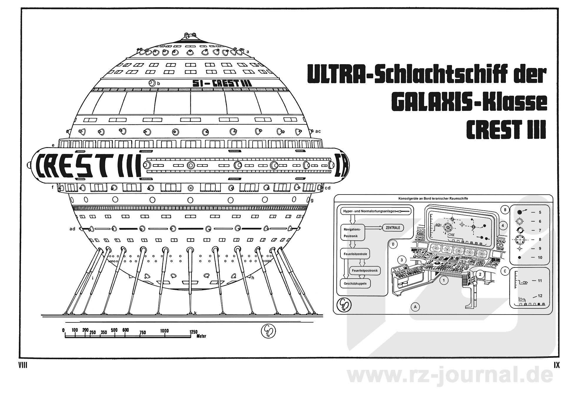 Bemerkungen: Die CREST III ist der erste Serienneubau der GALAXIS-Klasse. Sie wurde Anfang des Jahres 2404 in Dienst des Solaren Imperiums (Sl) gestellt, und im Ersteinsatz flog sie als Flaggschiff der Solaren Flotte erstmals zum Andromedanebel. |