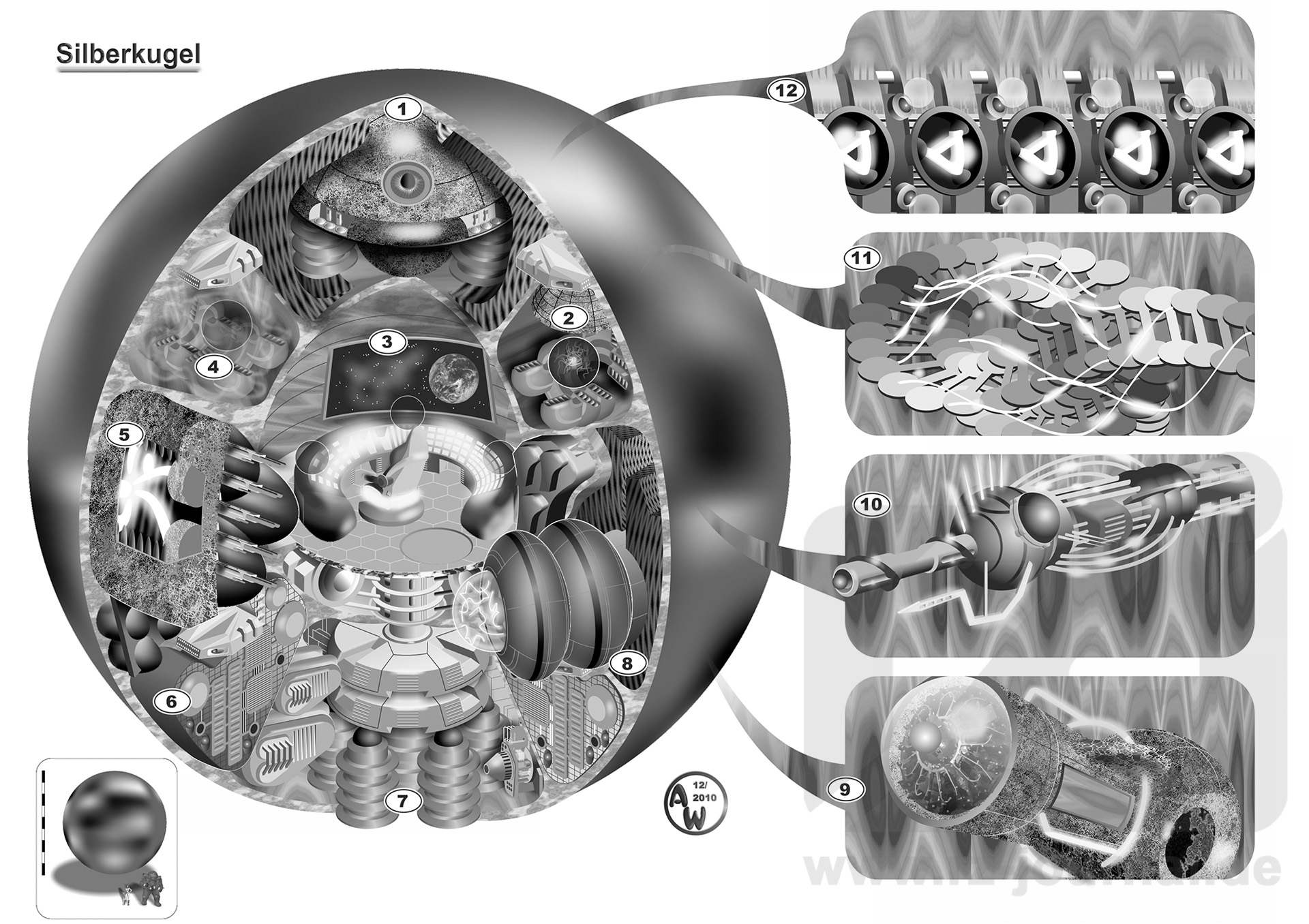In der Zeichnung dargestellt ist eine »Stardust«-Silberkugel, ausgerichtet auf ein terranisches Besatzungsmitglied. Zu sehen ist der Kernbereich, der in Größe und Struktur genauso komplett variabel ist, sowie ins Schiffsinnere »ausgelagerte« Aggregate. Wie in den rechts ausgegliederten Einzeldarstellungen erkennbar, bleiben teils ausgedehnte Komponenten in ihrer Hypereinbettung und werden dort angesteuert und genutzt. Die Einbindung in eine klare Deckstruktur kann dadurch entfallen. Zur Steuerung verschmilzt der Pilot aufgrund paramechanischer Erfassung und informeller Interaktion mental mit dem in die Gesamtstruktur der Silberkugel integrierten Rechnernetz. Die Steuerung ist auf eine Ein-Personen-Konfiguration ausgelegt und erfolgt mental durch Gedankenbefehle – ähnlich wie bei einer SERT-Haube, allerdings deutlich leistungsfähiger und nicht auf Emotionauten beschränkt. Rückmeldungen entstehen ebenfalls direkt im Bewusstsein des Piloten. Entsprechend der grundlegenden Variabilität kann der Pilot selbstverständlich auch akustische Kommunikation und dergleichen nach eigenem Gutdünken konfigurieren.