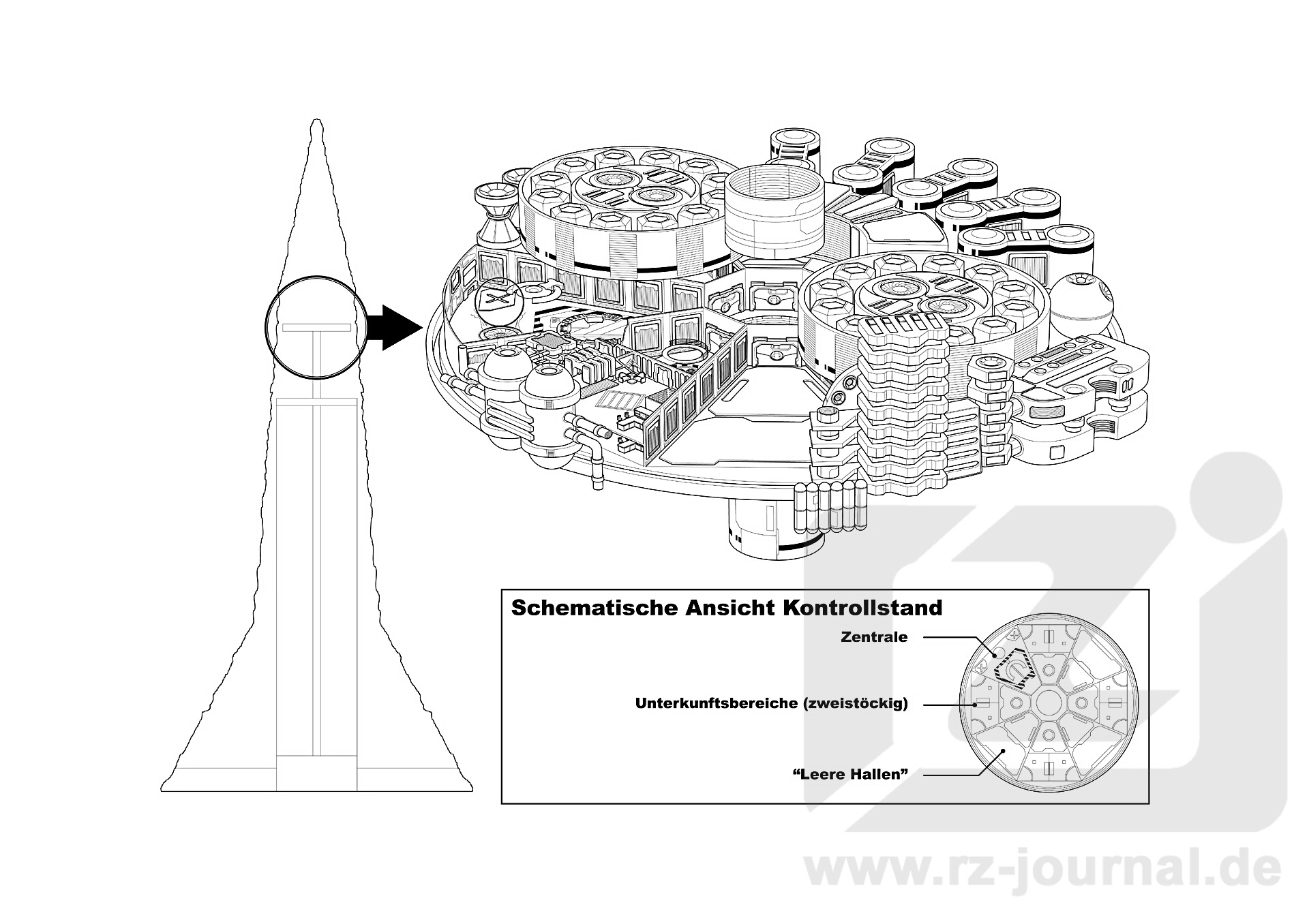 Allgemeines: Die Stardust-Felsennadel ist ein Monolith auf dem Planeten Aveda und Namensgeber des Stardust-Systems. Die Felsformation erinnert frappant an die STARDUST, jene dreistufige Rakete, mit der Perry Rhodan im Jahr 1971 zur ersten Mondlandung startete. Aufgrund dieser Ähnlichkeit und der Tatsache, dass das Stardust-System von der Superintelligenz ES den Menschen des von der Terminalen Kolonne TRAITOR belagerten Sonnensystems als Zufluchtsort angeboten wurde, lag schon sehr früh die Vermutung nahe, dass es sich hierbei nicht um einen natürlich entstandenen Felsen handelt. 1347 NGZ wurden bei Untersuchungen in der Felsennadel ortungsgeschützte Hohlräume entdeckt. Kurze Zeit später löste sich eine Materieprojektion auf und gab den Zugang zur Felsennadel frei. In der Folgezeit wurden weitere Räumlichkeiten zugänglich. Der Zugang zur Zentrale der Felsennadel befindet sich 710 Meter über dem Boden der Halle der 1000 Aufgaben. Vom zentralen Antigravschacht aus können acht Räume betreten werden, die wie Tortenstücke angeordnet sind. Im Norden liegt der Kontrollstand. Die Abschnitte Ost, Süd und West sind derzeit lediglich leere Hallen. Während im Bereich West ein Panoramaholo den Blick auf Stardust-City ermöglicht, ist in den Abschnitten Süd und Ost die Luft diesig und verdichtet sich in der Raummitte zu undurchdringlichem Nebel. Die Abschnitte Nord-Ost, Süd-Ost, Süd-West und Nord-West beinhalten Unterkünfte über zwei Etagen, die mit Nasszellen, Automatenküchen und anderen Annehmlichkeiten komfortabel ausgestattet sind. Im Kontrollstand dominiert ein großes Hufeisenpult (Durchmesser zwölf Meter). Davor befindet sich ein sieben Meter durchmessender Hologlobus. Die Stirnseite ist mit Bildschirmen versehen, die allesamt Maschinenblöcke in Räumen der Stardust-Felsennadel zeigen. Weitere Bildschirme entlang der Wände können aufgerufen werden. Als Sitzgelegenheiten dienen gelblich transparente Wolken aus Formenergie, die sich bei Berührung in variable Sessel transformieren. Die Anzeigen des Hufeisenpults erscheinen situationsbedingt und in Kombination mit akustischer Kommunikation mit dem zugehörigen Hauptrechner JOKER. Die Risszeichnung zeigt inzwischen bekannte Aggregate sowie Komponenten, von denen die Wissenschaftler durch Feinortung annehmen, dass sie spezielle Aufgaben erfüllen. |