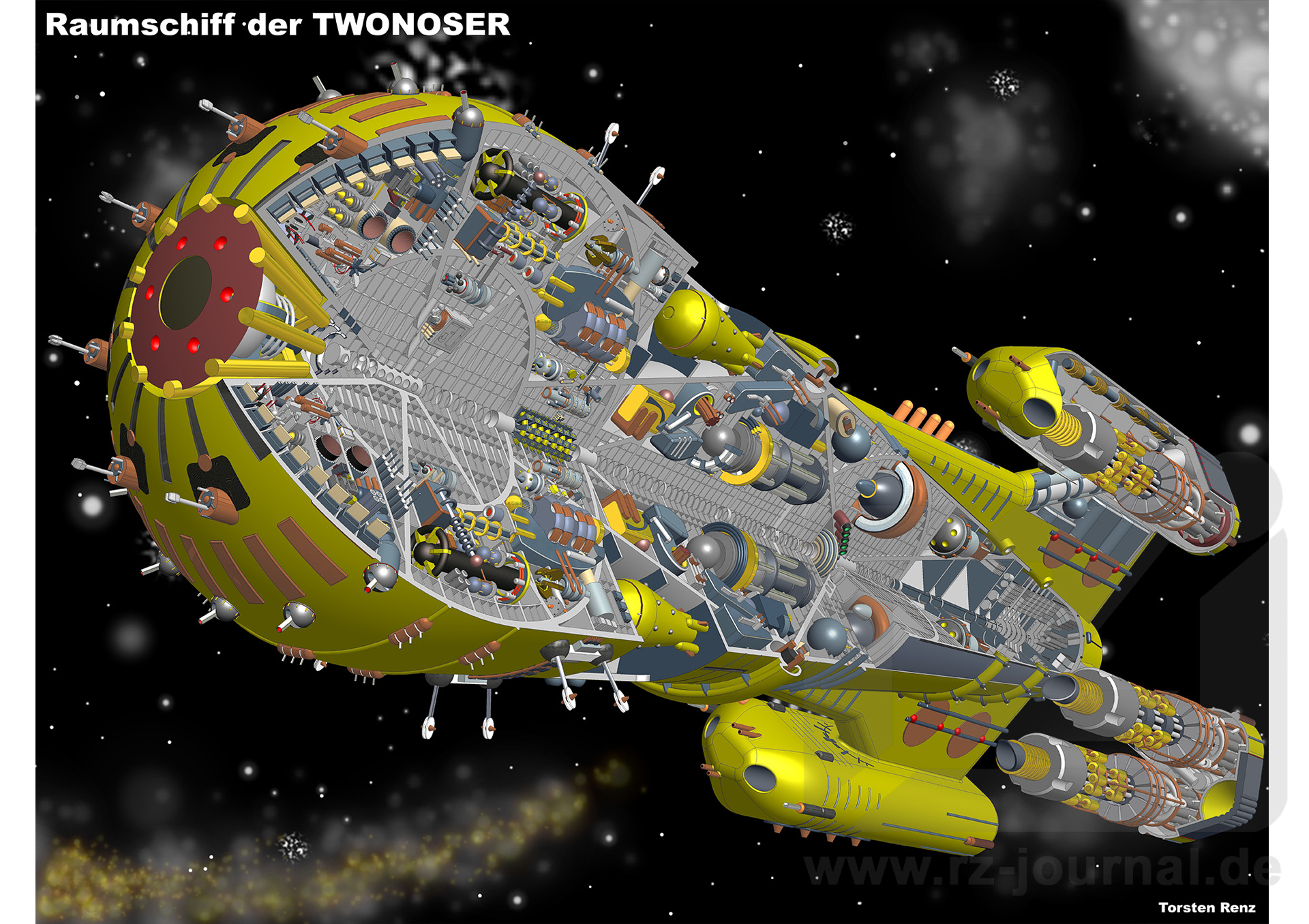 Allgemeines: Anfang des Jahres 1463 NGZ haben die in Andro-Beta lebenden Twonoser 421 Sonnensysteme besiedelt. Von der Hyperimpedanz-Erhöhung wurden sie besonders stark getroffen und bewegen sich deshalb noch auf einem relativ niedrigen technischen Niveau. Deshalb sind Raumschiffe mit Transitionsantrieb aktuell noch Standard. Das abgebildete Raumschiff der Twonoser gehört zur mittleren der hauptsächlich verwendeten drei Schiffsklassen. Es ist rund 500 Meter lang, die Bughalbkugel durchmisst 150 Meter und der Rumpf verjüngt sich bis zum Heck auf vierzig Meter im Durchmesser. Die Besatzungsstärke liegt bei ungefähr 600 bis 800 Personen. Die Außenhülle des Schiffes schimmert in einem warmen Goldton. Traditionsgemäß sind die vier Triebwerkspylone seitlich angeflanscht, in diesen werden auch die überdimensionierten Landestützen aufgenommen. Die Doppel-Impulstriebwerke ermöglichen eine maximale Beschleunigung von 55 km/s². Die Reichweite des Überlichtantriebs liegt bei nur 3,8 Lichtjahren für jede einzelne Transition. Um überhaupt den Überlichtsprung einleiten zu können, ist eine sehr hohe Mindestgeschwindigkeit von 270.000 km/s erforderlich. |