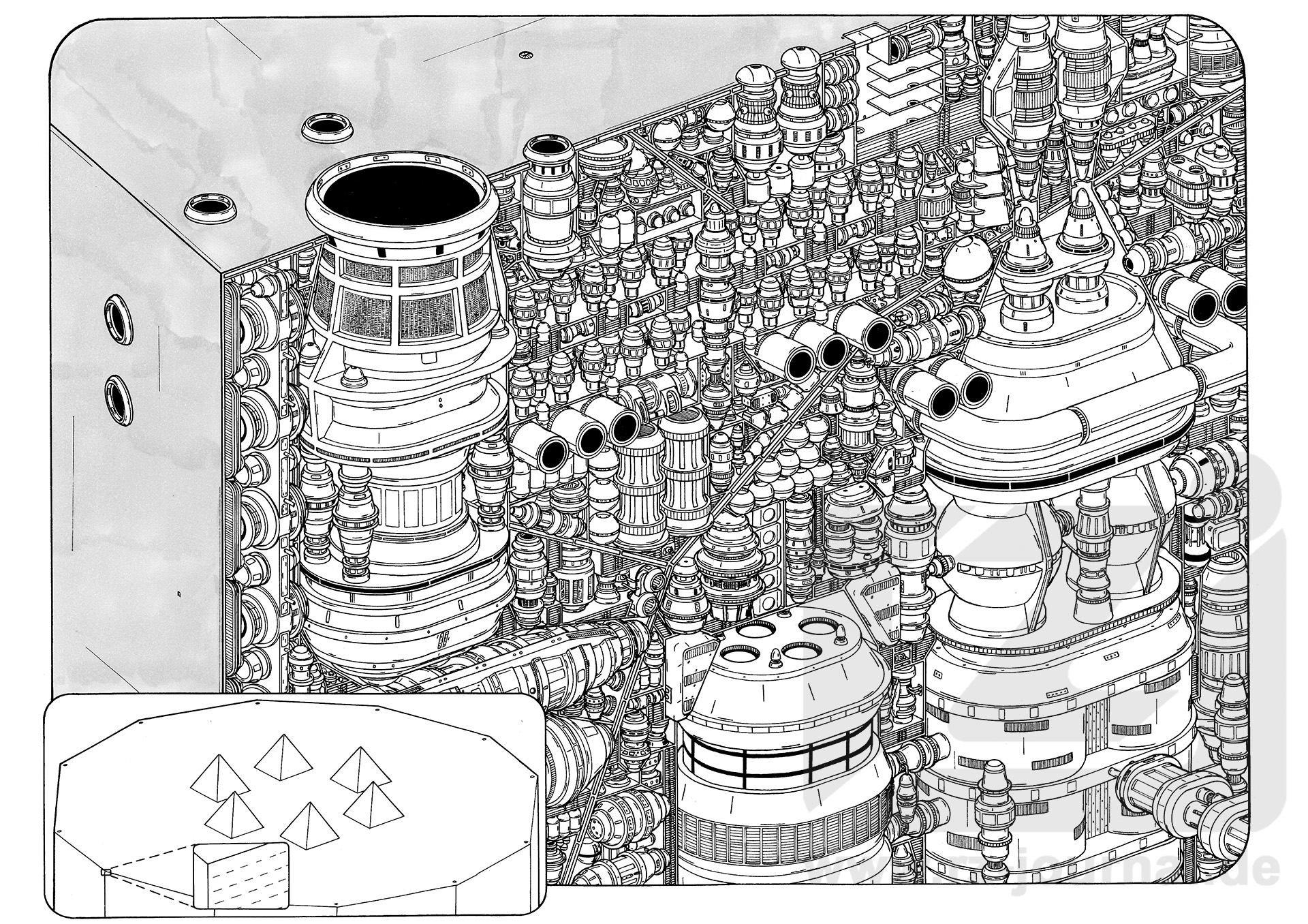 Die zweite aufgerissene Zeichnung zeigt das obere Ende einer Pyramide (der Aufriss ist ca. 1600 Meter hoch). Zu sehen ist hauptsächlich der Hypertron-Sonnenzapfer – bzw. den Anfang eines Sonnenzapfers; das Aggregat hat eine Höhe von mehreren Kilometern. Peripherie-Aggregate helfen beim Aufbau des Zapfstrahls und stabilisieren ihn. Hinzu kommen Energiespeicher und Fusionsreaktoren, um den Sonnenzapfer aus dem Ruhezustand hochzufahren.
