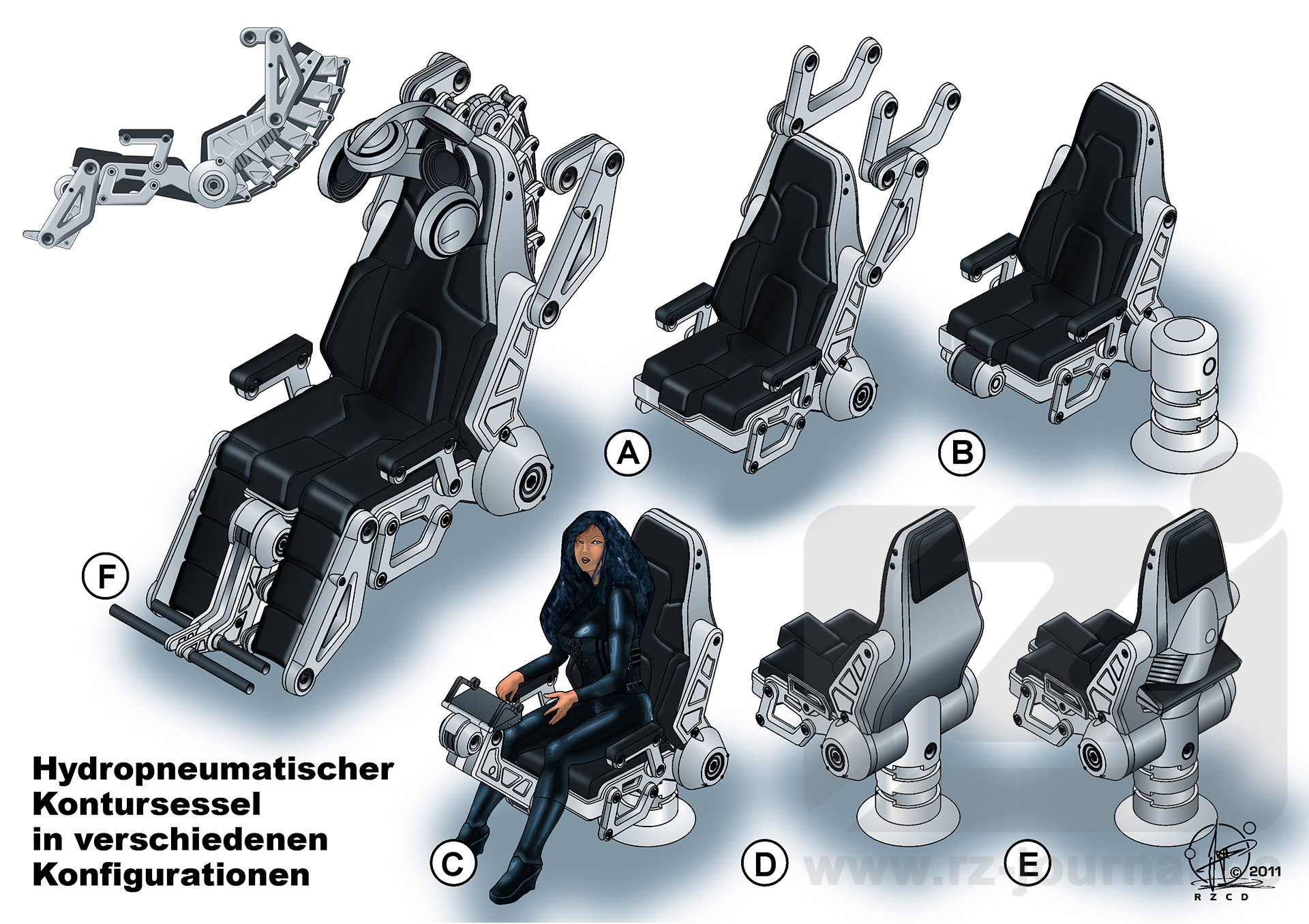 Bild E zeigt die erweiterte Modellvariante. Eine Positronik an der Rücklehne des Sessels ermöglicht eine Kommunikation mit der Bordkombination oder dem SERUN des oder der sitzenden Person; auf diese Weise können über die Weitergabe der individuellen Grunddaten die Grundfestigkeit des Gels und der Dämpfer im Voraus an Körpergröße, Gewicht und anatomische Besonderheiten angepasst werden.