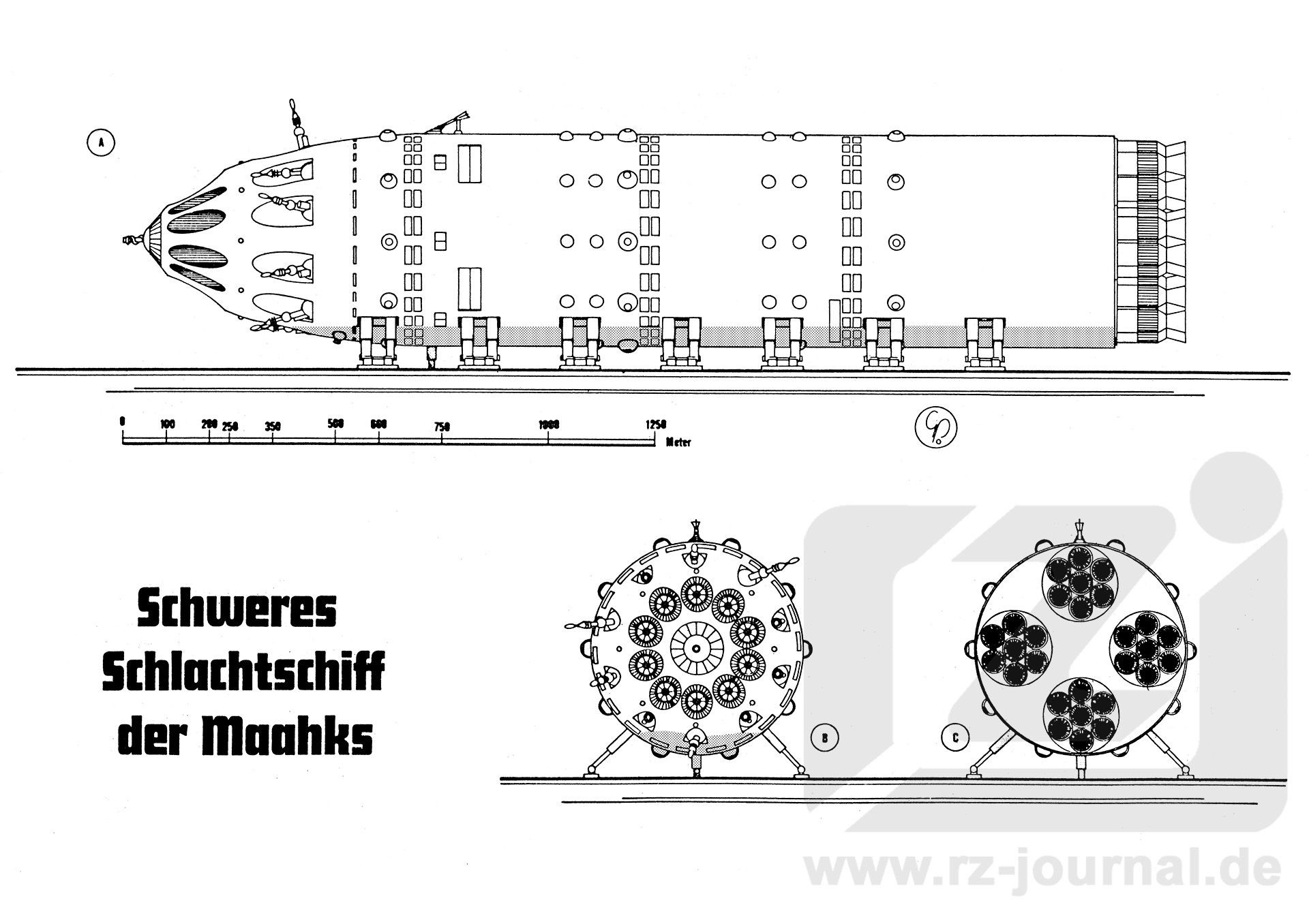 Volk: Maahks (der Maahk, des Maahks, die Maahks, Adj. maahksche). Die Maahks sind Wasserstoff-Methan-Ammoniak-Atmer undd leben auf Welten mit entsprechender Atmosphäre. Sie sind an eine Schwerkraft zwischen 2,9 und 3,1 Gravos gewöhnt, sie werden durchschnittlich 2,20 m groß mit einer Schulterbreite von 1,50 m. Sie sind entfernt menschenähnlich mit einer blaßgrauen Schuppenhaut. Der Kopf ist starr und halslos mit dem übrigen Körper verbunden. Er gleicht einem halbmondförmigen, langgezogenen Wulst, der von einer Schulter zur anderen reicht. An der höchsten Stelle dieses Kopfwulstes sitzen vier grünschillernde Augen mit einem Blickwinkel von 360 Grad. Der Mund befindet sich an der Übergangsstelle zwischen Wulst und übrigem Körper. Die Maahks sind eierlegende Intelligenzen, die meist neun Eier legen. Nach einem neunmonatigen Reifeprozeß schlüpft der Nachwuchs aus. Die Mentalität der Maahks unterscheidet sich stark von der des Menschen. Sie sind aus gesprochene Logiker, die kaum Gefühle kennen. Die Heimat der Maahks ist der Andromedanebel. Dort stießen die Terraner im Jahre 2401 auch erstmals auf dieses Volk, welches von den Meistern der Insel unterdrückt wurde. Bemerkungen: Die Zeichnung zeigt dieses stärkste maahksche Kriegsschiff A) von der Seite, B) von vorn und C) von hinten. Mit einem solchen Schiff flog auch GREK1 im Jahre 2401 in die Milchstraße ein, um eine Invasion einzuleiten. Dies konnte verhindert werden, und man gewann GREK 1 außerdem als äußerst zuverlässigen Verbündeten, der sich schließlich Ende 2402 auf Alpha-Zentra opferte. |