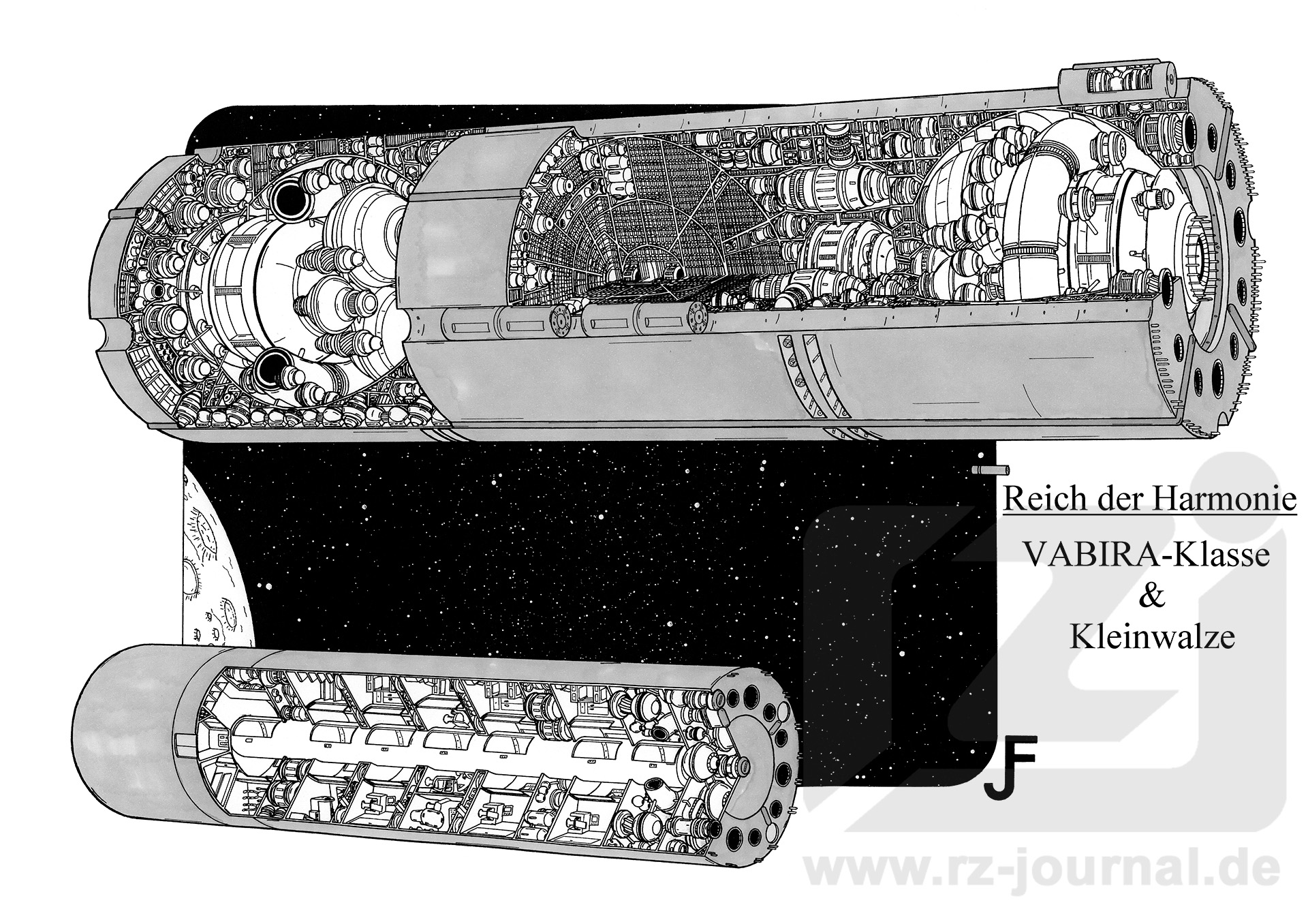 und neun Metern Durchmesser. Technische Daten: VABIRA-Klasse: - Besatzung: 1024 Personen (ohne Beibootbesatzungen) - Beiboote: max. 32 Schiffe der BOR-Klasse, max. 128 Kleinwalzen - Beschleunigung max. 180 km/s² (Mulon-Sublicht-Triebwerk: Hyperimpulse ohne konventionelle Stützmasse; Primärwirkung: katalytischer Hyperraum-Energieabfluss) - Überlichtfaktor max. ca. 2,2 Millionen (Pallon-Intermitter: Intermitter-Modus auf Transitionsbasis, bei dem pro Lil von 1,2 Sekunden 16 schockgedämpfte Sprünge über eine Distanz von je max. 25 Milliarden km zurückgelegt werden = ÜL-Faktor 1,112 Millionen; im Leerraum außerhalb von Escalian steigerbar auf max. 32 Sprünge = ÜL-Faktor 2,224 Millionen) – Mindestgeschwindigkeit für Intermitter-Modus 30 % der Lichtgeschwindigkeit - Bewaffnung defensiv: konventionell / Prallschirm, bläulich-grünes Fentall-Aufrissfeld (Wirkung vergleichbar HÜ-Schirm, Abstrahlung in Halbraum), bläulich-violettes Paltall-Aufrissfeld (Wirkung vergleichbar Paratronschirm, Abstrahlung in Hyperraum) - Bewaffnung offensiv: 4 Geschützketten mit Multi-Emittern für Narkose, Desintegrator, Thermostrahl, Feldkatapult für Strukturbomben, Pallon-Tunnel- und Pallon-Aufriss-Modus (Hyperimpuls durch Hypertunnelröhre vergleichbar KNK-Intervall und Aufriss vergleichbar Paratronwerfer); optional: angedockte Waffenmodule (bei Komplettersatz aller angedockten Großbeiboote als übergroße Geschützketten).