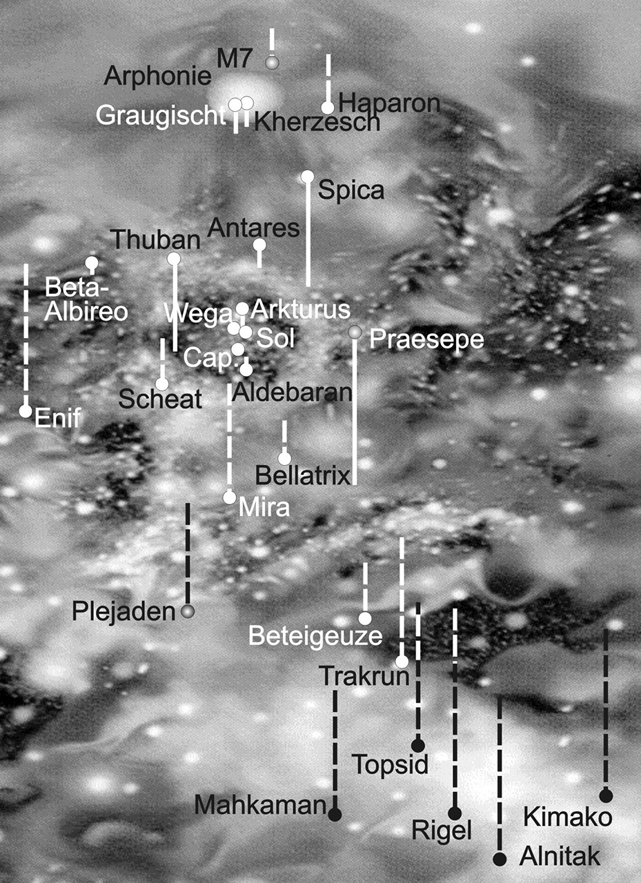 Godiun: zweiter von neun Planeten der weißen F-Sonne Prekemp; 500 Lichtjahre von Sol; Fundort von Hyperkristallen und Geburtswelt Arun Joschannans, der 1469 NGZ zum Ersten Terraner gewählt wurde. [PR EXTRA 15] Heymschels Planet: einziger Planet einer gelbweißen Sonne; 487 Lichtjahre von Sol; terranische Agramusterwelt, die am 21. Mai 2841 von Orkanen, Flutwellen und Hagelstürmen verwüstet wurde, weil infolge einer Manipulation NATHANS die Wettersteuerung versagte. [ATLAN 60] Ishtar: 498 Lichtjahre von Sol; terranische Kolonialwelt und Handelszentrum; 2361 erhielt Seymour Alcolaya den Auftrag, dem Verschwinden von Frachtschiffen auf den Grund zu gehen, die zwischen Ishtar und Suavity im Praesepe-Haufen verkehrten. Dadurch kam er Gen-Modulatoren aus dem Volk der Paddler auf die Spur. [PR-TB 31] Jago III: dritter von drei Planeten der großen roten Sonne Jagos Stern; Urwelt mit einer 2400 gegründeten terranischen Kolonie; hier richteten Tefroder 2404 eine geheime Multiduplikator-Station ein, die jedoch von Gucky, André Noir und Wuriu Sengu sowie Spezialisten der Solaren Abwehr erobert wurde. [PR 282] Maharani: siebter von 38 Planeten der der Blauen Riesensonne Yogul, 503 Lichtjahre von Sol; erdähnlicher Planet, auf dem 2156 die erste terranische Kolonie im Plejadensektor gegründet wurde; dass die ersten Siedler Maharanis dem irdischen Subkontinent Indien entstammten, prägte das Aussehen der planetaren Hauptstadt Goyn; der sehr reiche Planet nimmt traditionsgemäß eine Vorrangstellung unter den terranischen Welten in den Plejaden ein und ist die Hauptwelt des Plejadenbundes. Während der Sitzung des Rates der Administratoren in der Solar-Hall von Terrania am 1. Dezember 2404 präsentierte sich Garviah, der Administrator des Yogul-Systems, als nüchterner Kritiker der Politik Perry Rhodans. [PR 280] Nach der Entführung des Solsystems 5. September 1469 NGZ wurde Maharani zur neuen Zentralwelt der LFT bestimmt. [PR 2625] Im Yogul-System sind auch der 5., 6. und 8. Planet, Radscha, Sampur und Mohenjo, von Terranern besiedelt. Mohenjo ist Sitz der Kristallbörse. [PR EXTRA 15] Maja (20 Tauri): B8-Sonne, 490 Lichtjahre von Sol Meredi IV: vierter von zwölf Planeten der Sonne Meredi; 496 Lichtjahre von Sol; von Terranern besiedelte Dschungelwelt mit aggressiver Fauna; in Anpassung an ihre neue Heimat weisen die Kolonisten eine kupferrote Haut und smaragdgrüne Augen auf; von Meredi IV stammte der USO-Spezialist Captain Arl Tratlo, der den Ehrennamen Dreitöter trug, weil es ihm gelungen war, am gleichen Tag eine Tarak-Echse, einen Randler und einen Sechsflügler zu besiegen. [PR 257] Merope (23 Tauri): B6-Sonne, 489 Lichtjahre von Sol Monerspoint: zweiter von sieben Planeten der Sonne Sukran; 496 Lichtjahre von Sol; von zivilisatorisch zurückgefallenen Arkon-Kolonisten, den Sukranern, bewohnter Planet, der sich jedoch dem Solaren Imperium anschloss; im Oktober 2436 vereitelten Gucky und Harl Dephin den Plan des von Monerspoint stammenden und mit den Akonen zusammenarbeitenden Majors Rugilat Pichens, in das Solsystem einen Spontan-Modifizierungs-Katalysator einzuschmuggeln, der die Sonne in eine Nova verwandeln sollte. Der Sukraner wollte durch diese Tat seine Heimat vor der Zeitpolizei bewahren. [PR 371] Ourwaine: 485 Lichtjahre von Sol; Wasserwelt mit einer terranischen Kolonie, deren Angehörige infolge einer Umweltanpassung amphibische Züge aufweisen; 2388 war der Ourwainer General Roman Brielle Chef des HQ-Sicherheitsdienstes von Quinto-Center. [PR-TB 22] Pleione (28 Tauri): veränderliche Be-Sonne; 517 Lichtjahre von Sol Sempron I: erster von 15 Planeten der Sonne Sempron; 506 Lichtjahre von Sol; 2398 gegründete terranische Kolonie; 2436 versuchte der durch Wahlmanipulation und Mord an die Macht gekommene sempronesische Administrator Gwydlin Grichert, der mit der Condos Vasac, einer von Akonen und Antis getragenen Untergrundorganisation, zusammenarbeitete, Heiko Anrath zu entlarven, der nach dem Verschwinden des Großadministrators Perry Rhodans Rolle spielen musste. Dies wurde jedoch vereitelt. [PR 330/331] Auch Sempron IV und XI sind besiedelt. Sterope II (22 Tauri): A0-Sonne; 484 Lichtjahre von Sol Taygeta (19 Tauri): B6-Sonne; 503 Lichtjahre von Sol Tigris: 516 Lichtjahre von Sol; als Zwischenstation und Warenumschlagplatz genutzter Planet, auf den Dan Picot, der Erste Offizier von Nome Tschatos LION, geriet, als er 2341 der Spur aus Terrania entführter Kinder folgte. [PR-TB 25] Vono I: einziger Planet der Sonne Vono (nicht identisch mit der Sonne Epsals); 515 Lichtjahre von Sol; kalte Wüstenwelt im Porada-Bezirk des Plejaden-Sektors, auf der 2361 eine autarke Roboter-Kolonie errichtet werden sollte. Es zeigte sich jedoch, dass in einer subplanetaren Station die drei letzten Mitglieder eines alten Volkes schliefen, die andere Wesen in ihre Träume zu versetzen vermochten. [PR-TB 37] Voodool: sechster von sechs Planeten der blauen Riesensonne Lasura, 511 Lichtjahre von Sol; 2396 gegründete terranische Kolonie; 2400 wurde unter Mitwirkung von Raumkapitän Guy Nelson der Versuch einzelner Kolonisten vereitelt, mithilfe eines akonischen Transmitternetzes und einer Raumschiffsfalle das Stufenraumschiff ANDROTEST zu kapern und die Macht im Solaren Imperium zu übernehmen. [PR-TB 30] Wachowitz: 513 Lichtjahre von Sol; terranische Kolonialwelt, die für den Stzitschtscha, ein eisgekühlt genossenes, gelblichgrün schillerndes alkoholisches Getränk bekannt ist. [PR 230] (Hinweis: Alle Angaben beziehen sich auf die Darstellung der Plejaden in der PERRY RHODAN-SERIE, in der weitgehend vom astronomischen Wissensstand der sechziger Jahre des vorigen Jahrhunderts ausgegangen wird. Nach neueren Erkenntnissen der Astronomie ist der Sternhaufen nur rund 380 Lichtjahre von der Erde entfernt.) |