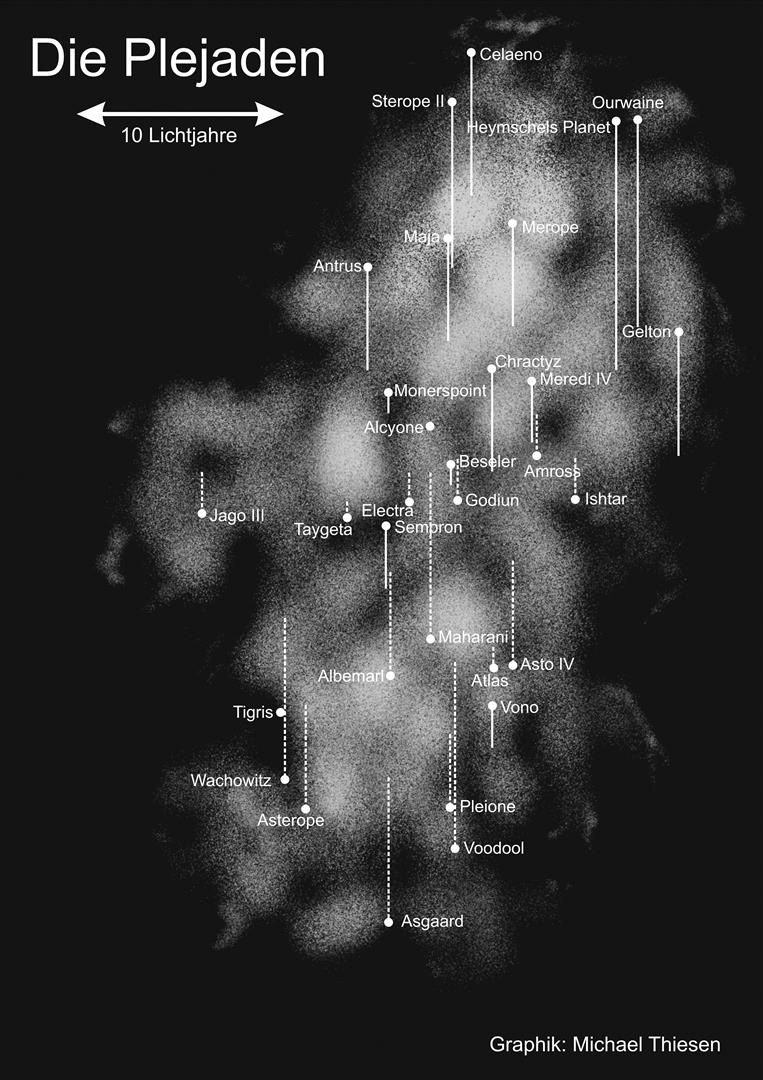 Die Plejaden (M 45 oder NGC 1432) sind ein offener Sternhaufen im Sternbild Taurus, der vom Solsystem aus 500 Lichtjahre entfernt etwa in Richtung der westlichen Milchstraßenperipherie, allerdings rund 200 Lichtjahre unterhalb der galaktischen Hauptebene, liegt. Er umfasst ungefähr 300 Sterne und misst in seiner größten Ausdehnung etwa 40 Lichtjahre. Die Plejaden-Detailkarte ist ebenso orientiert wie die Übersichtskarte, d.h. die Anordnung der Systeme ist so dargestellt, wie sie vom westlichen Milchstraßenrand aus zu sehen wäre. Dabei zeigen die senkrechten Linien der Detailkarte, wie weit die einzelnen System oberhalb (durchgezogene Linie) bzw. unterhalb (gestrichelte Linie) einer Ebene stehen, die parallel der Milchstraßenhauptebene, aber 200 Lichtjahre unter dieser liegt und die in etwa durch Alcyone und Tigris definiert wird. Als Siebengestirn sind die Plejaden bereits seit der Antike bekannt. Ihre hellsten Sterne wurden nach sieben Nymphen, den Töchtern des Titanen Atlas und der Pleione benannt, die in der Mythologie ebenfalls als Plejaden bezeichnet werden. Die Besiedelung der Plejaden durch die Terraner setzte in der Mitte des 22. Jahrhunderts ein. Welten des Sternhaufens zu kolonisieren hatte den logistischen Vorteil, dass die Siedlungswelten von einem zentralen Punkt aus versorgt werden konnten. Außerdem lagen die Plejaden weit genug von Terra entfernt, um den Kolonisten ein Gefühl der Eigenständigkeit zu vermitteln, zugleich aber doch so nahe, dass sie notfalls geschützt werden konnten. Außerdem stand der Sternhaufen weitgehend außerhalb des Interessenfokus anderer galaktischer Mächte, auch wenn sich bereits im späten 20. Jahrhundert Topsider auf einer Plejadenwelt niedergelassen hatten. Nach Erreichen der Selbstständigkeit schlossen sich terranische Plejadenwelten zum Plejaden-Bund zusammen, der inzwischen der LFT assoziiert ist. 1469 NGZ gehören dem Bund 68 Welten an. Albermarl: 508 Lichtjahre von Sol; die Dschungelwelt beherbergte die Forschungsstation »Heinrich Hertz«, die im Jahr 3442 von der Hyperdim-Mechanikerin und Kosmonautin Orana Sestore, Perry Rhodans späterer Ehefrau geleitet wurde. [PR 550] Alcyone (auch Alkione, Eta Tauri): 495 Lichtjahre von Sol; B7-Sonne Amross IV: 496 Lichtjahre von Sol; hier führten der Waringer-Schüler Aarlon DeVanten und sein Assistent, der Reaktor- und Hochenergieingenieur Fodor Tarinow, 2841 ein verbotenes Experiment durch. Nach der Verhaftung der beiden bei ASIALECTRIC beschäftigten Wissenschaftler nahmen die USO-Spezialisten Ronald Tekener und Sinclair Marout Kennon ihre Identitäten an, um sich in das Umfeld des verbrecherischen Multimilliardärs Professor Durbin Hoykalare einschmuggeln zu können. [ATLAN 52] Antrus IV: vierter von vier Planeten der Sonne Antrus, 492 Lichtjahre von Sol; terranische Kolonie. Im April 2404 versuchten die Kolonisten unter Führung ihres Administrators Rayan Homend, die Regierungsneuwahlen zu verhindern und lange vor dem Ende vorgeschriebene Besiedlungsfrist von einhundert Jahren ihre außenpolitische Autarkie von Terra zu erzwingen. Nachdem dies von Homer G. Adams unterbunden worden war, brachte Homend, der im Auftrag des akonischen Energiekommandos agierte und von der Condos Vasac unterstützt wurde, über akonische Großbanken 850 Milliarden mit einem tefrodischen Multiduplikator erzeugte falsche Solarnoten im Umlauf. Dass er sich zudem mit den streng geheimen Konstruktionsunterlagen für den Zustandswandler und den Zielmaterialisator der terranischen Transformkanone nach Lepso absetzte, zwang den USO-Spezialisten Ronald Tekener zum Eingreifen. [ATLAN 1] Auf Antrus II existiert eine Sekundärkolonie der Antruser. Asgaard: vierter von zwölf Planeten der F5-Sonne Kyndir, 522 Lichtjahre von Sol; terranische Kolonialwelt. 2406 wurde hier der terranische Wissenschaftler Doc Andoveer Tarmac mit Unterstützung einheimischer Froschwesen auf den Tefroder-Duplo Skania Velder aufmerksam, der im Auftrag der MdI durch Schmelzen der Polkappen eine Umweltkatastrophe auslösen sollte, um einen Schlage gegen die Niederlassung der Raumakademie vorzubereiten. Tarmac gelang es, den Duplo zu töten. [PR-TB 49] Asterope (Sterope I; 21 Tauri): B8-Sonne; 517 Lichtjahre von Sol ASTO IV: 506 Lichtjahre von Sol; paradiesischer Planet, der Anfang des 25. Jahrhunderts das bedeutendste medizinisch-biologische Forschungszentrum des Solaren Imperiums beherbergte; hier wurden 2401 die an der Zentrumspest erkrankten Raumfahrer Halgor Sörlund, Cole Harper, Son-Hao, Imar Arcus und Hegete Hegha von der EX-8080 behandelt, die später in Allan D. Mercants Auftrag als Todeskommando zu den Maahks flogen und von diesen gegen Duplos ausgetauscht wurden. [PR 221] Atlas (27 Tauri): B8-Sonne, 510 Lichtjahre von Sol Beseler: zweiter von drei Planeten der Sonne Verve; 500 Lichtjahre von Sol; Dschungelwelt, die Anfang des 25. Jahrhunderts als Strafplanet der USO bzw. des Solaren Imperiums diente. Hier unternahmen die USO-Spezialisten Ronald Tekener und Sinclair Marout Kennon im Juli 2407 ein Täuschungsmanöver, um der Condos Vasac auf die Spur zu kommen. [ATLAN 8] Celaeno (21 Tauri): B7-Sonne; 474 Lichtjahre von Sol Chractyz: vierter von 14 Planeten der roten Riesensonne Muchoon, 497 Lichtjahre von Sol; Ende des 20. Jahrhunderts von den Topsidern besiedelt; von den Maharani daher Echsenland genannt; Fundort von Hyperkristallen; 1448 NGZ war die hier ansässige Firma Mineralhandel Topsid in die betrügerischen Geschäfte der First Fertile Crystal Batches verwickelt, die Homer G. Adams mit Unterstützung des jungen Arun Joschannan aufdeckte. [PR EXTRA 15] Electra (17 Tauri): B6-Sonne; 501 Lichtjahre von Sol Gelton: zweiter Planet der Sonne Santey; 494 Lichtjahre von Sol; terranische Kolonialwelt; hier scheiterte Mitte des 24. Jahrhunderts ein Attentat auf Perry Rhodan, das Aras und Akonen mittels einer Bakterienbombe zu unternehmen suchten. [PR-TB 15] |