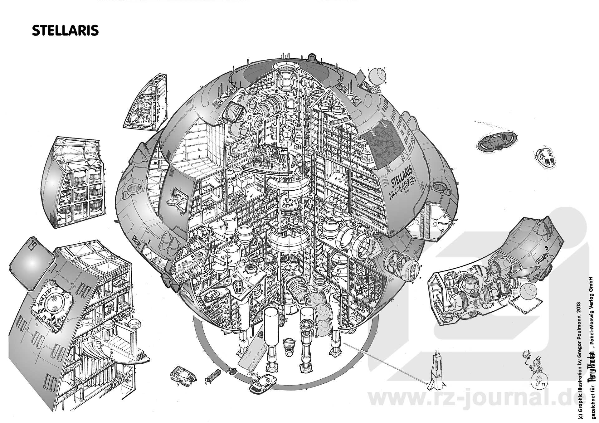 Die STELLARIS ist eine typische Vertreterin für die mittelgroßen kommerziellen Raumtransporter, die zwischen den Handelswelten der Milchstraße pendeln und das Gros des interstellaren Schiffverkehrs darstellen. Der Frachter wurde in den 30er Jahren des 14. Jahrhunderts NGZ in Dienst gestellt und ist im Lauf der Zeit mehrfach überholt und an die Bedürfnisse der jeweiligen Stammbesatzungen angepasst worden. Die STELLARIS basiert auf der 200 Meter durchmessenden Kugelzelle eines Schweren Kreuzers der MINERVA-Klasse und bietet ein Raumvolumen von etwa 4,7 Millionen Kubikmetern, verteilt über 40 Decks. Jedes Deck mit einer Höhe von fünf Metern ist unterteilt in einen Nutzbereich und ein Zwischendeck, in dem dezentralisiert die gesamten Lebenserhaltungs- und Schwerkraftanlagen des Schiffes untergebracht sind. Die Triebwerke verleihen dem Frachter ein Beschleunigungsvermögen von 100 km/s². Es werden etwa 200 Personen zum Betrieb des Schiffes benötigt; die Besatzungsstärke variiert jedoch je nach Auslastung und Auftrag des Schiffes. Aufgrund der variablen Modulbauweise ist die STELLARIS keineswegs auf bestimmte Transportgüter festgelegt. Die Module sind um das »Rückgrat« des Schiffes angeordnet, einen rund sechzehn Meter durchmessenden Zylinder, der das Schiff von Pol zu Pol durchzieht. Es stehen zwanzig Steckplätze für Transportmodule in den verschiedensten Ausführungen zur Verfügung, die je nach Transportauftrag belegt werden können. Module können an vielen Raumhäfen von spezialisierten Unternehmen oder Reedern getauscht, gemietet, geleast oder gekauft werden. |