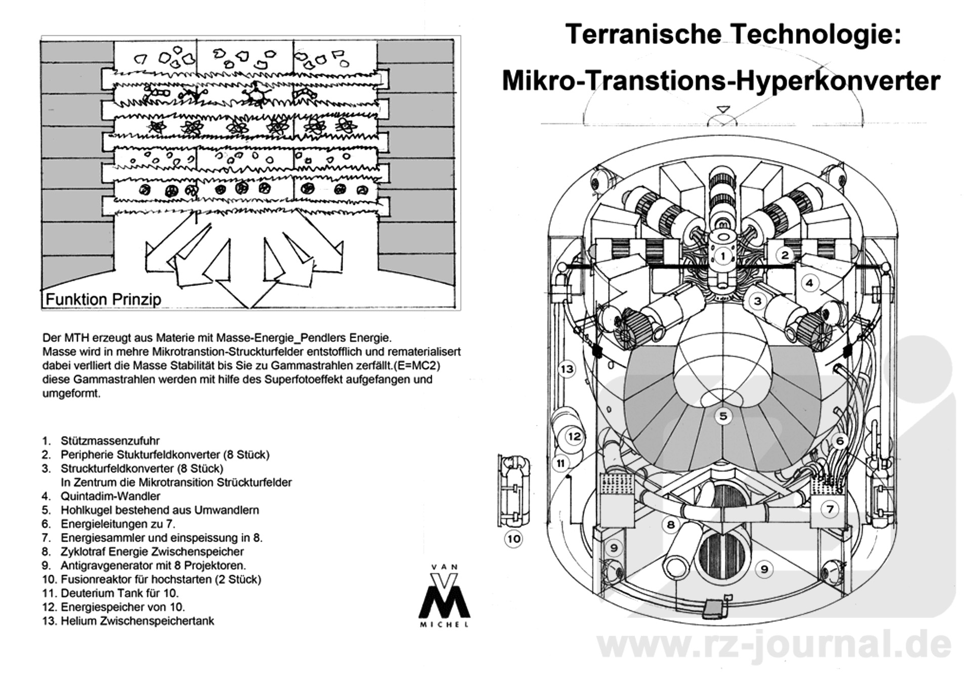 »MTH Prototyp Innenaufbau« Als Basismasse dient im Allgemeinen sogenanntes Wasserstoff-Komprimat - in kugelförmigen Lagertanks befinden sich die Aggregate für den' eigentlichen Kraftfeldtank, dessen (gravomechanisches Hyper-)Pressfeld den Wasserstoff hyperphysikalisch auf eine Lagerdichte von 50 Tonnen pro Kubikmeter komprimiert. Bei Zusatzbedarf kann Wasserstoff mittels großer Prallfeldtrichter aus dem All oder aus den Atmosphären von Gasriesen gesaugt und eingelagert werden. Dieser Brennstoff kann auch von den Fusionsreaktoren genutzt werden. In der zivilen Raumfahrt wird versucht, für den Primärbrennstoff eine Optimierung zwischen einer maximal mitzuführenden Brennstoffmasse bei minimalem Raumbedarf, Energieversorgungsaufwand und den daraus entstehenden Beschaffungskosten zu finden. So kommen meist Brennstoffe aus Silikaten, Kohlenstoffen und Eisen zum Einsatz. Die Leistungsausbeute ist allerdings entsprechend reduziert. Dieser Brennstoff in fester Form wird in der Regel in Form von zwei Millimeter durchmessenden Kugeln hergestellt, die ohne größere Probleme leicht gelagert und transportiert werden können. In der militärischen Raumfahrt wird versucht, für den Primärbrennstoff eine Optimierung zwischen einer maximal mitzuführenden Brennstoffmasse bei minimalem Raumbedarf zu finden, während die Beschaffungskosten nur eine nachgeordnete Rolle spielen. Deshalb findet sich hier neben Wasserstoff-Komprimat immer noch NUGAS, welches zwar eine schlechte relative Brennstoffmasse bezogen auf den Gesamtvolumenbedarf von Tank und Komprimierungssystemen aufweist, jedoch selbst im Vergleich mit Wasserstoff-Komprimat eine immer noch unschlagbare absolute Brennstoffmasse pro Kubikmeter Tank besitzt. NUGAS-Reaktoren sind deshalb im militärischen Bereich ebenfalls noch in der Anwendung. Der MTH in der Forschung: Der MTH hat sein gesamtes Potenzial mit größter Wahrscheinlichkeit noch nicht ausgeschöpft. Da in einem MTH die Umwandlung von Materie in konventionelle Energieformen über den Zwischenschritt der Nutzung von Hyperenergie stattfindet, ist der nächste logische Schritt der Weiterentwicklung, auf eine Zwischenumwandlung der Materie in normalenergetische Zustandsformen zu verzichten und einen direkten Umwandlungsprozess von Materie in nutzbare Hyperenergie zu erreichen. Dieser Prozess stand vor Erhöhung der Hyperimpedanz schon durch den Hypertrop-Zapfer zur Verfügung und kann zurzeit nur unter sehr hohem Aufwand in der Sonnenzapfung (Hypertron-Zapfer) realisiert werden. Solch ein neuer Prozess würde die Quintadim- Wandlerverluste vermeiden und könnte zur direkten Versorgung von auf Hyperenergie basierenden Geräten genutzt werden. Ein weiteres Forschungsfeld besteht bei den Primärbrennstoffen. Neben den in zivilen und militärischen Anwendungen bereits genutzten Materie-Arten wie Wasserstoff-Komprimat oder Silikat-Pellets wird intensiv nach Alternativen gesucht. Dabei werden Energiedichte, Volumen und Beschaffungskosten als Hauptkriterien berücksichtigt. Es befinden sich strukturverdichtete Materialien, wie Arkon-T-Stahl und Ynkeloniüm-Terkonit in der Erprobung. Weiterhin gibt es Studien zu dem Thema, ob sich Materie von exotischen Hochschwerkraftobjekten, etwa die Kernmaterie von Gas-Riesen oder sogar Quark-Sternen, für eine Gewinnung als MTH-Brennstoff eignen würde. |
