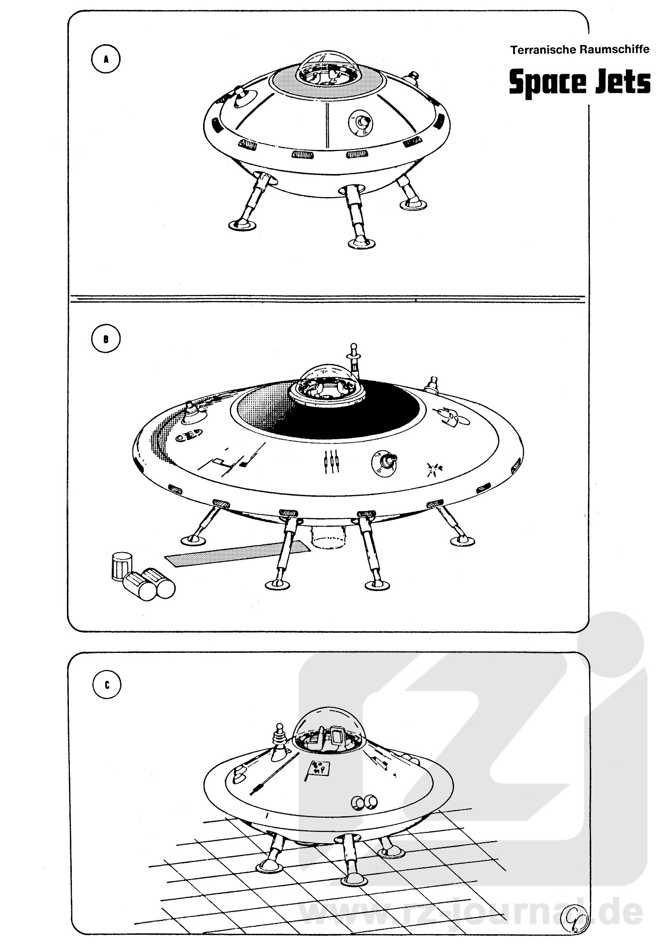 der Jet, B Space-Jet ca. 2041- C Mini-Space-Jet. ca. 2231- Kategorien: A Aufklärer und Landungsschiff für Einsatztruppen B Fernaufklärer, Kurierschiff, Erkunder, Kampfschiff C Kleinst-Beiboot als Rettungsschiff und leichter Aufklärer für Spezialeinsätze Abmessungen: A Ø 30 m; Höhe 18 m; Standhöhe 21 m B Ø 33-55 m (hier 50 m); Höhe