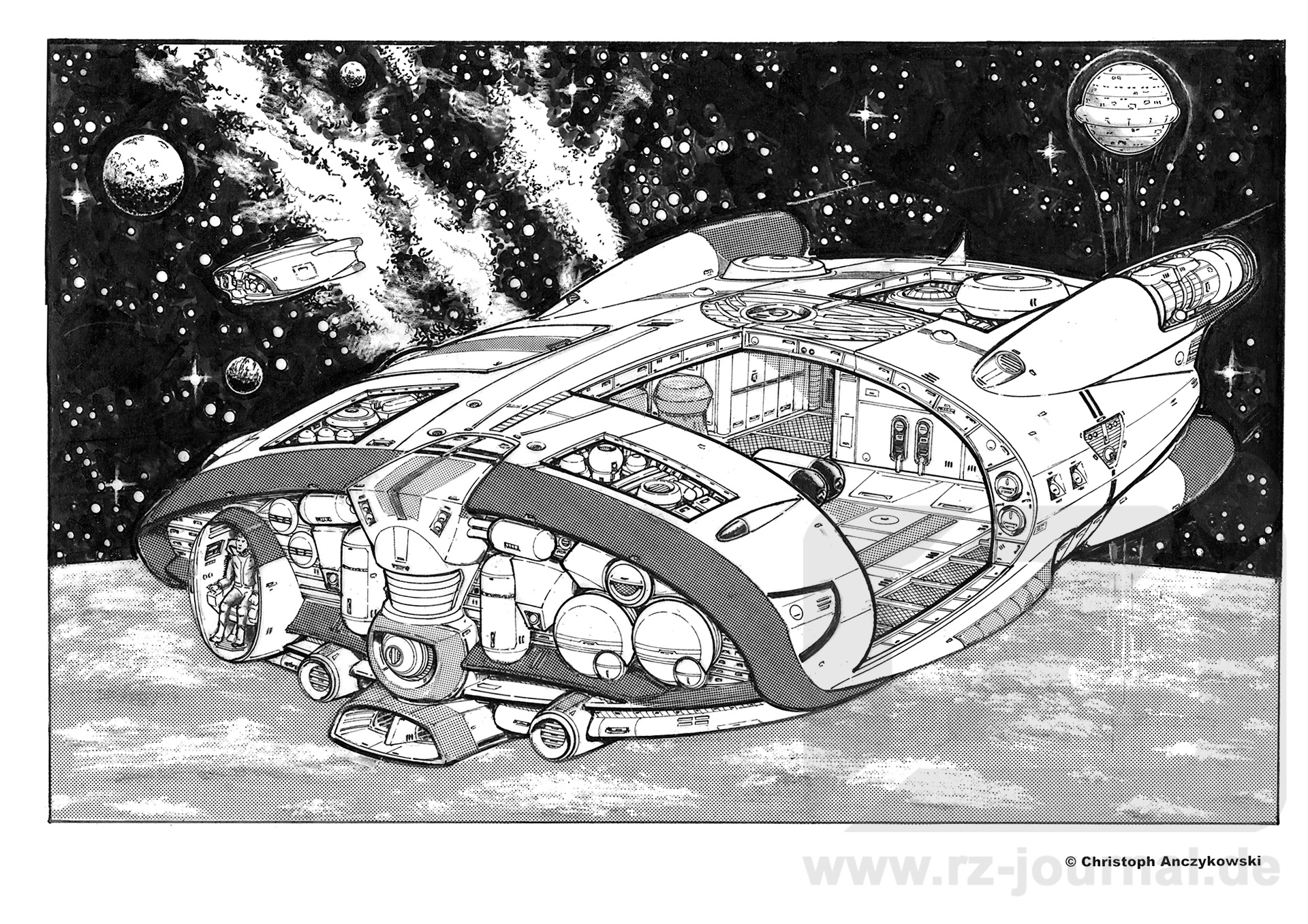 www.rz-journal.de - © by Christoph Anczykowski und Perry Rhodan - published in PR 2843 - Abdruck mit freundlicher Genehmigung der Pabel-Moewig Verlag KG, Rastatt Die Verwendung der Zeichnungen auf einer eigenen Homepage ist nur mit Genehmigung des Zeichners, des Verlages und unter Benennung der Bezugsquelle und des Copyrightinhabers gestattet. Verlinkung sind nur auf die Originalquelle zulässig. |
