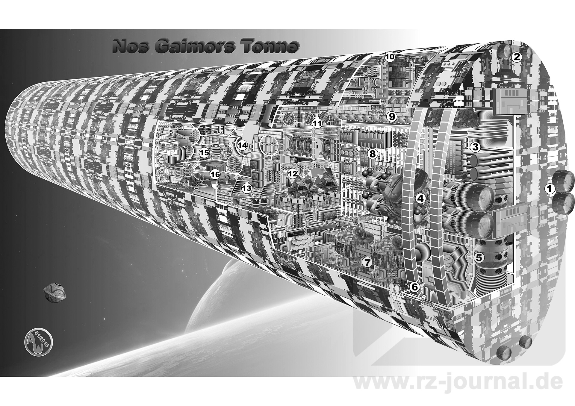 Das Gebilde, das später als »Nos Gaimors TONNE« bekannt wurde, ist eines der Mysterien der Milchstraße. Als Nos Gaimor es in den 3440er Jahren bei einer Expedition ins galaktische Zentrum im Raum treibend fand, war es bereits verlassen. Nur Vermutungen konnten über seinen ehemaligen Zweck angestellt werden. Nos Gaimor vermutete darin eine Rettungsstation eines fremden, längst ausgestorbenen Volkes. Fünf Jahre seines Lebens widmete er der Erforschung des tonnenartigen Gebildes, erlernte jedoch lediglich die Bedienung des technischen Inventars. Die Weitläufigkeit und Unübersichtlichkeit des Inneren der Station erschwerte seine Arbeit zusätzlich. Schließlich beschränkte er sich darauf, sie zu benutzen, flog sie ins Ardin-System und schwang sich mit Hilfe der Möglichkeiten der TONNE zum Schutzherren des Planeten Yoopsin auf. Er starb schließlich an Bord der beweglichen Raumstation während eines Duells um die Einsetzung als Erster Hetran der Milchstraße. Nach Nos Gaimors Tod blieb die TONNE am Sammelpunkt der Bewerber zurück. Wann und von wem sie wieder ins Ardin-System zurückgebracht wurde, ist nicht dokumentiert. Zunächst schwenkte sie wieder in einen Orbit um Yoopsin ein. Später wurde sie in eine Umlaufbahn um den siebten Planeten des Systems gebracht. Der Mangel an Mitteln im Ardin-System und die gleichzeitige Weigerung, anderen Parteien Zugang zu gewähren, erschwerte die Erforschung der TONNE. Daher ist bis heute noch nicht viel mehr über dieses rätselhafte Raumfahrzeug bekannt, als schon Nos Gaimor herausgefunden hatte. Im Inneren der Tonne herrschen teils unterschiedliche Schwerkraftvektoren. Viele große Sektionen von Räumlichkeiten lassen sich nur über einen einzigen oder wenige Zugänge erreichen. Nos Gaimor erschlossen sich dadurch immer wieder neue große Areale der Station, als er sich mit ihrem Aufbau und ihrer Funktionsweise vertraut machte. Die Maschinerie der Anlagen ist von wechselndem Design und nicht immer ersichtlichem Zweck. Nur einige Aggregate lassen sich von ihrer Funktion her zuordnen. Technische Daten: Länge: ca. 3.500 Meter Durchmesser: ca. 700 Meter Beschleunigungsvermögen: bis zu 80 km / sec.² Besatzung: ursprünglich sicher mehrere hundert Individuen, die entweder erheblich größer als Menschen oder Flugwesen gewesen sein müssen. |