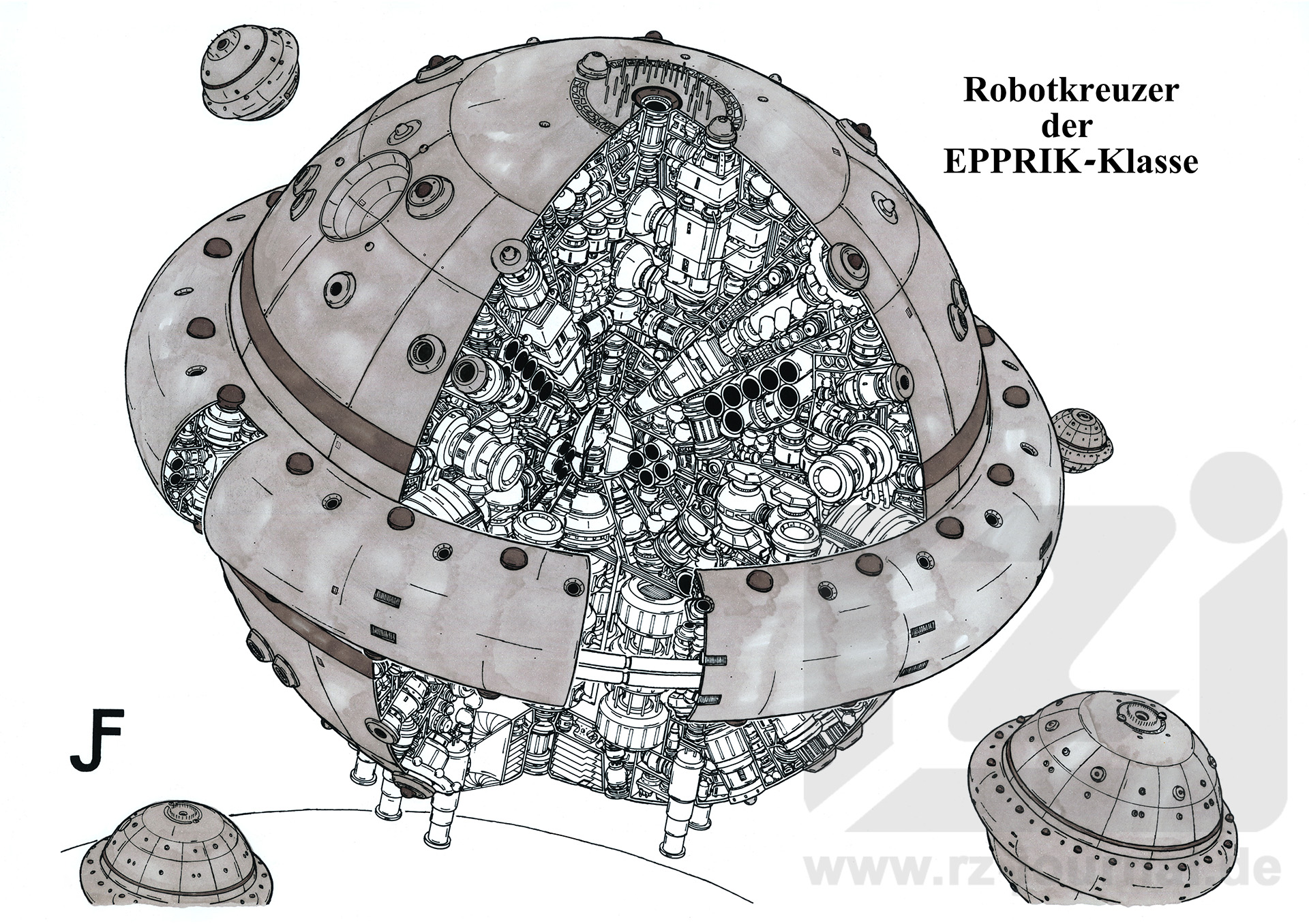 Allgemeines: Die 500 Meter durchmessenden Schlachtkreuzer der EPPRIK-Klasse sind eine Entwicklung des arkonidischen Imperiums, die von Tormanac da Hozarius ab dem Ende des 15. Jahrhunderts NGZ vorangetrieben wurde. Es handelt sich um schwer bewaffnete, schnelle Einheiten, die mit hochwertiger Schutzschrimtechnologie ausgestattet sind und daraufhin konzipiert wurden, vollständig ohne Besatzung zu agieren. Es handelt sich also um Robotraumer, ähnlich zu denen, wie sie früher zu Zeiten des Robotregenten eingesetzt wurden, sind aber natürlich wesentlich weiter entwickelt. Bis 1514 NGZ wurden fast 250.000 Einheiten dieser Klasse produziert, seit der bis ins Jahr 1519 NGZ projektierten zwangsweisen Räumung des Arkon-Systems können aber die EPPRIK-Kreuzer nur sporadisch aufgerüstet werden. Die EPPRIK-Kreuzer haben einen Durchmesser von 500 Metern, der Ringwulst hat einen Durchmesser von 600 Metern bei einer Höhe von 100 Metern. Im Inneren gibt es keine Aufenthaltsmöglichkeiten für eine Besatzung, auch auf Lebenserhaltungssysteme wurde komplett verzichtet. Zwischen den verschiedenen Aggregaten gibt es lediglich Wartungsgänge für diverse Servoroboter. |