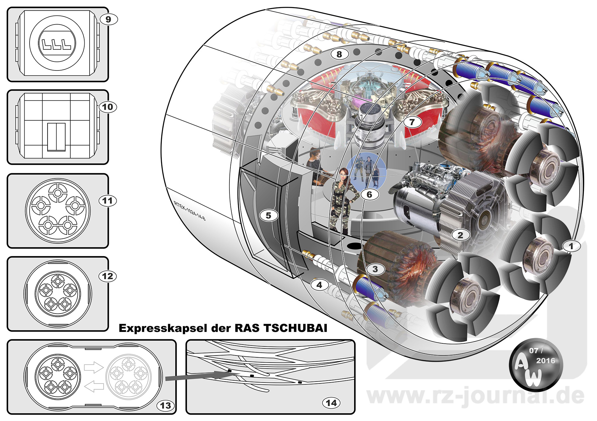 Allgemeines: Die RAS TSCHUBAI ist durchzogen von einem Adergeflecht von Röhren, durch die insgesamt 2048 Personentransport-Expresskapseln eilen. Diese Zahl ist notwendig, um eine Besatzung von 35.000 Personen plus 50.000 Posbis in einem Volumen von 15,4 km³ jederzeit von jedem Ort zu jedem anderen transportieren zu können. Die Kapseln funktionieren auf niedrigem technischen Niveau, fast ohne Hypertechnik, nach dem Prinzip einer Magnetschwebebahn. Elektromagnetische Linearmotoren in der Tunnelwand sorgen für reibungsfreien Abstand. Der doppelte Stabilisatorensatz dient als magnetischer Gegenpol für das stabile Gleiten durch das Vakuum der Röhren. Den Vortrieb erzeugen die Linearmotoren in Bug und Heck. Eine Expresskapsel kann mit ihnen eine Geschwindigkeit von 1800 km/h (= 500 m/s) erreichen, auf die mit 1000 m/s² beschleunigt wird. Diese Werte sind nur dank ausgefeilter Andruckabsorber-Technik möglich, die einzige 5-D-Komponente an dem System. Eine vorgegebene Fahrtrichtung gibt es nicht; die Transportkapazität erhöht sich dadurch um den Faktor 1,5. Die Steuerung obliegt den Schiffspositroniken. Spurwechsel erfolgen über eingebaute Doppelweichen. Die innersten horizontalen Ringe haben in der Regel nur zwei Weichen, eine nach außen, eine nach innen innerhalb desselben Ringsystems. Je weiter außen sich ein Ringtunnel befindet, umso mehr Weichen hat er. Das Gleiche gilt für Verbindungen zwischen den Horizontalweichen zum vertikalen Wechsel in höher oder tiefer liegende Ringebenen. |