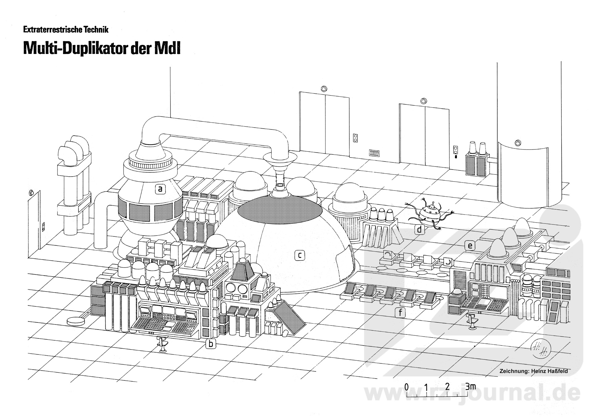 Funktionsweise: Erfahrungen erlauben es, die Wirkungsweise eines Multi-Duplikators zu beschreiben. Mit großer Wahrscheinlichkeit arbeitet ein Multi- Duplikator nach einem ähnlichen Prinzip wie ein Materietransmitter, nur mit dem Unterschied, daß keine Materie befördert, sondern aus entsprechenden Grundstoffen ein Duplikat des betreffenden Gegenstandes hergestellt wird. Die subatomare Strukturerfassung und -rekonstruktion dürfte, wie bei einem Transmitter, gleich sein. Die zu duplizierende Materie wird jedoch nicht in einen hyperenergetischen Impuls umgewandelt, sondern bleibt unverändert bestehen. Beim Multi-Duplikator wird die erfaßte Struktur auf Feldschablonen gespeichert, so daß zu einem beliebigen Zeitpunkt weitere Duplikate des Originals hergestellt werden können. Bemerkung: Dieser dargestellte Multi-Duplikator kann nur Gegenstände bis zu einer Größe von zirka einem Meter, also Handfeuerwaffen, Rückentornister für Raumanzüge und andere technische Gegenstände, herstellen. |