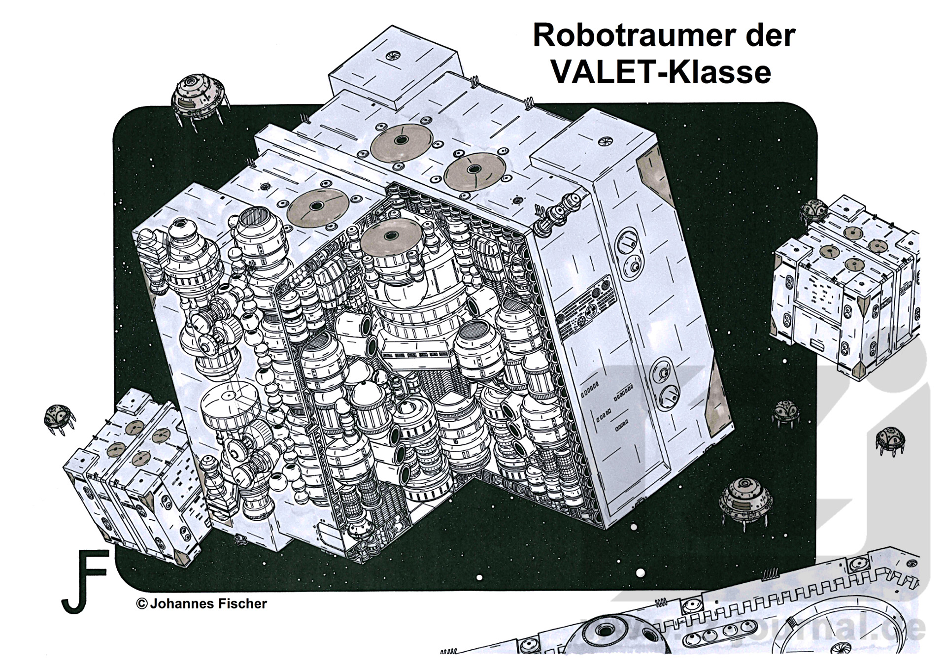 Die YART FULGEN – das neue Flaggschiff der USO – besitzt neben den herkömmlichen Kugelraumern als Beiboote auch insgesamt 45 abkoppelbare „Modulwürfel“ als Beiboote. Diese Würfel der VALET-Klasse haben eine Kantenlänge von 500 Metern und sind als Robotraumer ohne menschliche Besatzung konzipiert. Sie können aber – im Gegensatz zu den arkonidischen EPPRIK-Kreuzern – für eine geringe Zeit eine Besatzung unterbringen, etwa für Evakuierungszwecke. Die VALET-Raumer sind schwer bewaffnete Einheiten, dafür sind die Überlicht-Triebwerke schwächer ausgelegt, als bei anderen Einheiten vergleichbarer Größe. Dies unterstreicht auch den Beiboot-Charakter. |