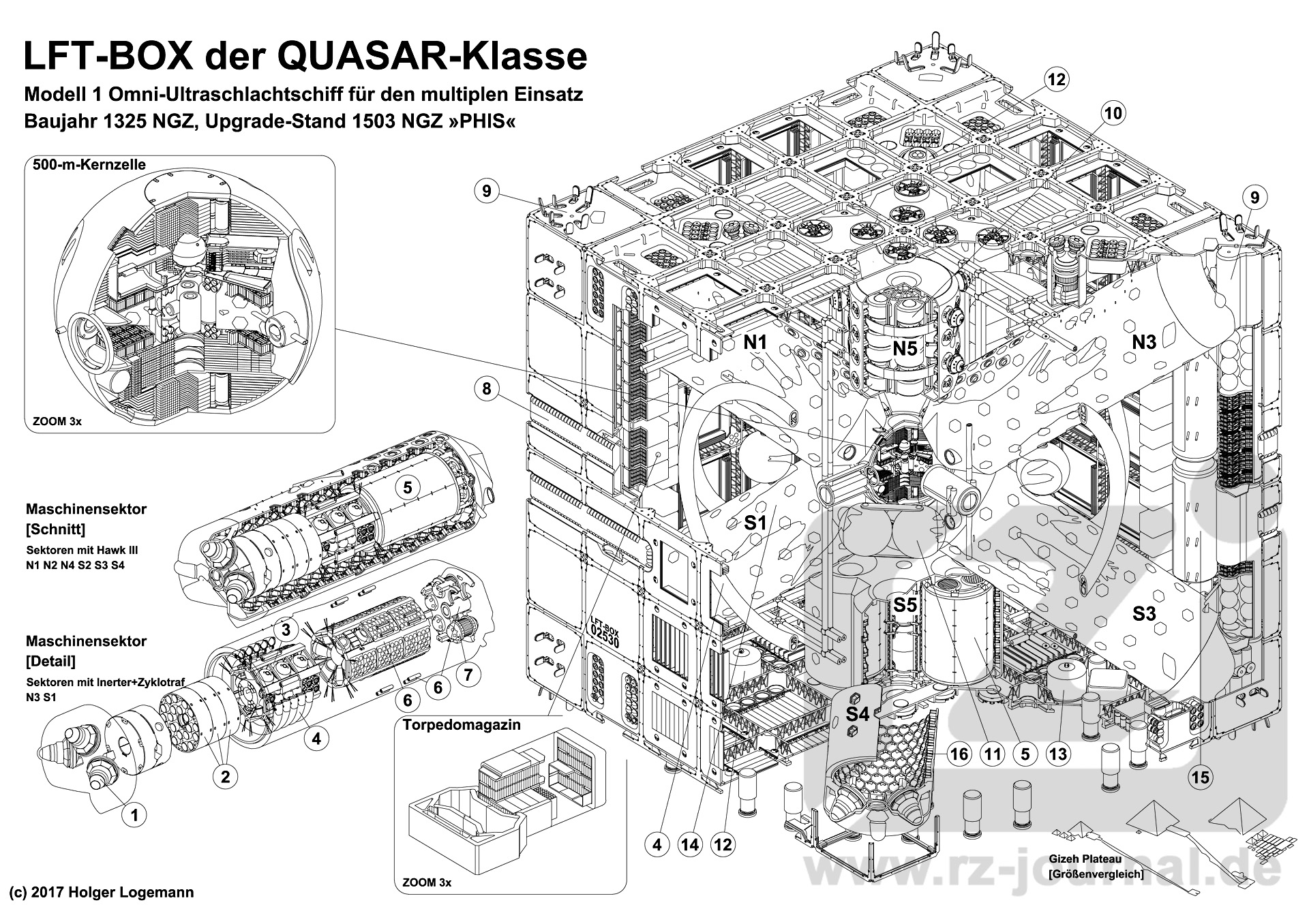 Die LFT-BOXen stellen sowohl die größten Standardeinheiten als auch in ihrer Gesamtheit den Hauptanteil der Feuerkraft der LFT-Flotte dar. Das dargestellte Modell 1 ist das noch immer am weitesten verbreitete unter den LFT-BOXen. 50.000 von den Posbis erbaute und bemannte Einheiten wurden 1325 NGZ der LFT zur Verfügung gestellt. Vor dem Hyperimpedanz-Schock noch mit Syntroniken und Metagrav-Antrieb ausgestattet, wurden sie nach dem HI-Schock und den nachfolgenden Jahrzehnten fortwährend dem aktuellen Stand der Technik angepasst. Sie sind primär für den Kampfeinsatz konstruiert, über Modulwechsel leicht und ohne Werftaufenthalt umrüstbar. Die Hohlräume können aufgabenspezifisch ausgebaut werden. Der interkonnektfähige Basisrahmen ermöglicht das Mitführen externe Lasten oder, mit anderen LFT-BOXen, die Bildung größerer Verbundraumer bis hin zu mobilen Stützpunkten. Abmessungen: 3000 Meter Kantenlänge, 32 Landestützen 100 Meter im Durchmesser und 100 Meter ausfahrbar Besatzung: ein Plasmakommandant, 100-200 Matten-Willys, 35.000 Posbis, 200 Personen Schiffsführung, optional 20.000 Passagiere Antrieb: Hawk III, Not-Transition, Gravopuls, Protonenstrahl-Impuls, Antigrav; Maximalbeschleunigung 250km/s², ÜL-Faktor 1 Mill. Standard u. 2,5 Mill. maximal Reichweite 500.000 Lichtjahre (zehn Hawk-III-Konverter) Bewaffnung: Repuls-Paratron mit Paros-Wandlern, HÜ-Schirm, hypermagnetische Abwehrkalotte und Prallschirm Paratronwerfer: sechs; Dissonanzgeschütze: zwei; VRITRA-Geschütze: zwei; überschwere Hyperpulswerfer: zwei und mittelschwere: 80; MVH-Überlicht-Geschütze: 120 und -Sublicht-: 120; Transformgeschütze: 180; Impulsgeschütze: 120; Sonden- und Torpedowerfer: acht Beiboote: Leichte Kreuzer der MERKUR- und DIANA-Klasse: je fünf in modifizierter Ausführung, Fracht-Personen-Shuttles: 124: Container- und Lastenschlepper: 25; eine vollrobotische Erz-Schürfeinheit und ein Wasserstoffsammler |