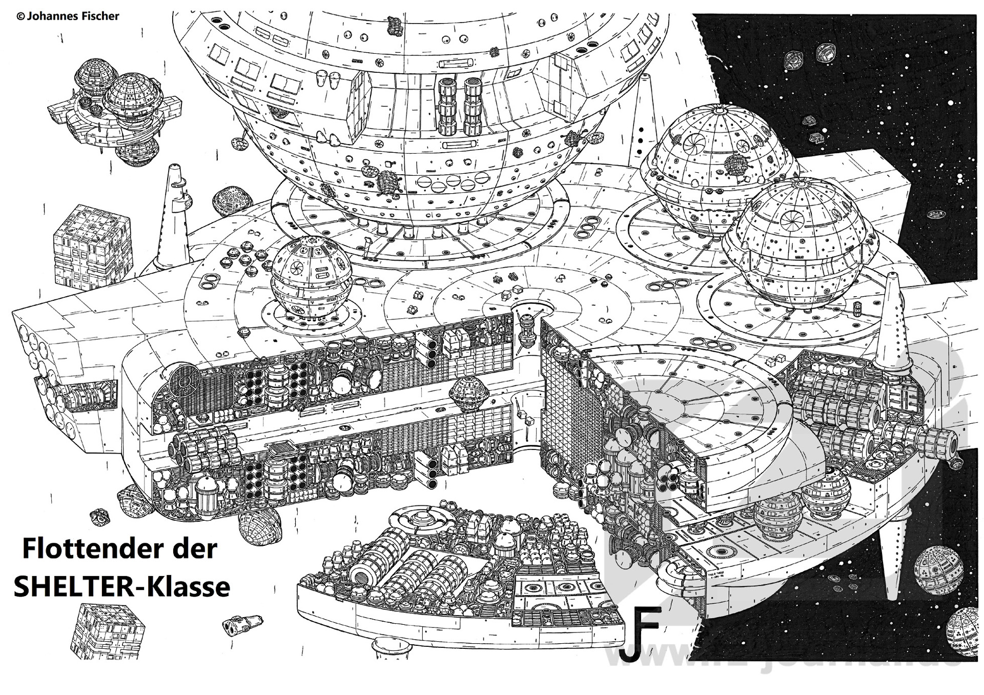 Die Flottentender der SHELTER - Klasse sind die Weiterentwicklung der PONTON - Klasse. Wie bei diesen basiert ihr Aufbau auf einer Scheibe mit einem Durchmesser von 5000 Metern und einer Höhe von 1000 Metern. Dazu kommen je zwei Triebwerksgondeln an Bug und Heck, sodass die Gesamtlänge 5700 Meter beträgt. Die Hauptaufgabe der SHELTER - Tender besteht in der Wartung und Reparatur von Schiffen bis zur JUPITER - Größe (2500 Meter Durchmesser). Darüber hinaus können diese Tender auch eine große Anzahl von Passagieren versorgen (bis zu 40.000 Personen) und als mobile Werften fungieren. |
