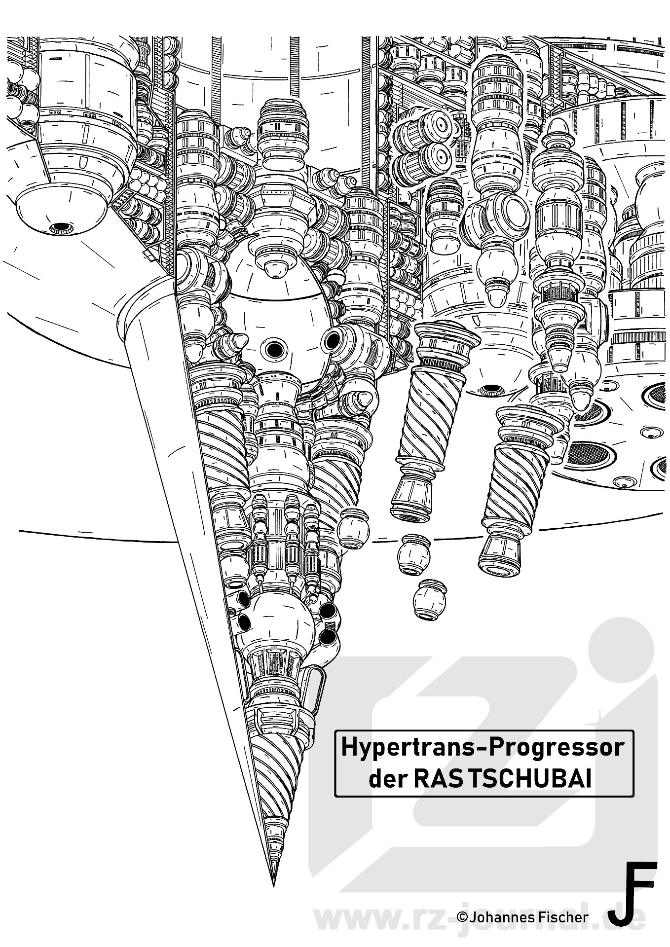 Der Hypertrans-Progressor stellt eine Kombination aus Forschungen um den Trafitron-Antrieb der JULES VERNE und bereits bekannten Anwendungen der Paratron-Technologie wie dem Schattenmodus und dem Axapan-Effekt dar. Er war nach dem Hyperimpedanz-Schock der erste funktionierende Fernantrieb. Der abschließende Testflug erfolgte 1514 NGZ mit der STARDIVER. Danach wurde nur das eine Exemplar des Antriebs für die RAS TSCHUBAI gebaut, da einerseits der überaus seltene Hyperkristall Salkrit benötigt wird, andererseits während des Fluges gesundheitsschädliche Strahlung auftritt, sodass die Besatzung diesen in Suspension verbringen muss. Innerhalb einer Galaxis können mit dem Hypertrans-Progressor nur Überlichtfaktoren von maximal 2,5 Millionen erreicht werden, Außerhalb des Schwerkraftfeldes einer Galaxis steigt der Überlichtfaktor auf bis zu 500 Millionen. Hauptbestandteile des Hypertrans-Progressors sind neben der salkritdotierten Außenhülle zwei ausfahrbare Polkegel mit Durchmessern von 200 Metern und einer Höhe von 540 Metern, die im inaktiven Modus in Schächten von 200 Metern Durchmesser und 555 Metern Höhe ruhen. |