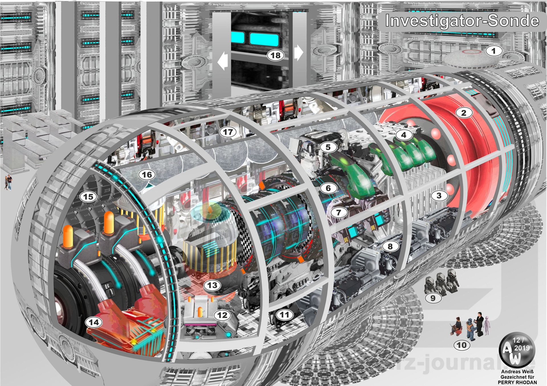 Allgemeines: Investigator-Sonden, auch kurz »InSos« genannt, wurden gezielt dafür entwickelt, unauffällig und hochgradig autonom in fremden Systemen Aufklärung zu betreiben. Mit einem Maß von 35 Metern Länge und 10 Metern Durchmesser haben sie ungefähr das Volumen einer mittelgroßen Space-Jet und sind innerhalb der Weiten eines Planetensystems unauffällig. Die Sonden verfügen über ein kombiniertes Unterlicht- und Lineartriebwerk der Tevver-Reihe. Das Aggregat ermöglich eine Beschleunigung von 400 m/s2 im Unterlichtflug und bietet bis zu 50 Lichtjahre Reichweite pro Linearetappe. Die Maximalreichweite beträgt 1000 Lichtjahre. Zusätzlich ist ein Transitionstriebwerk mit an Bord für Fälle, in denen der Flug durch den Linearraum nicht sicher ist. Pro Transition können zwei Lichtjahre unter Einsatz von Strukturschockdämpfern erreicht werden. Ungedämpft ist eine Sprungweite von vier Licht-jahren erzielbar – dann allerdings leicht zu orten. Als Defensivbewaffnung sind ein Thermostrahler zur Meteoritenabwehr und eine 50-Kilotonnen-Transform-kanone mit 10 Schuss an Bord, deren wichtigste Funktion es ist, die gegnerische Ortung zu blenden, während die Sonde auf Fluchtkurs geht. Die Sonde baut auf ihren Ortungsschutz und starke Schutzschirme. Sonden, die in Gefahr sind, in gegnerische Hand zu fallen, sprengen sich selbst. Am wichtigsten ist die hochwertige Ortungs- und Kommunikationstechnologie samt Translatoren, hochwertiger Dechiffrierrechner und Hyperfunksender mit starker Bündelung, außerdem die leistungsstarke Positronik für die autonome Missionssteuerung. Weil auf keine Besatzung Rücksicht genommen werden muss, sind Investigator-Sonden relativ kostengünstig in großer Stückzahl zu produzieren. Ihren Einsatzzweck finden sie da, wo der Einsatz bemannter Beiboote zu riskant ist oder großvolumig systematische Aufklärung betrieben werden soll. |