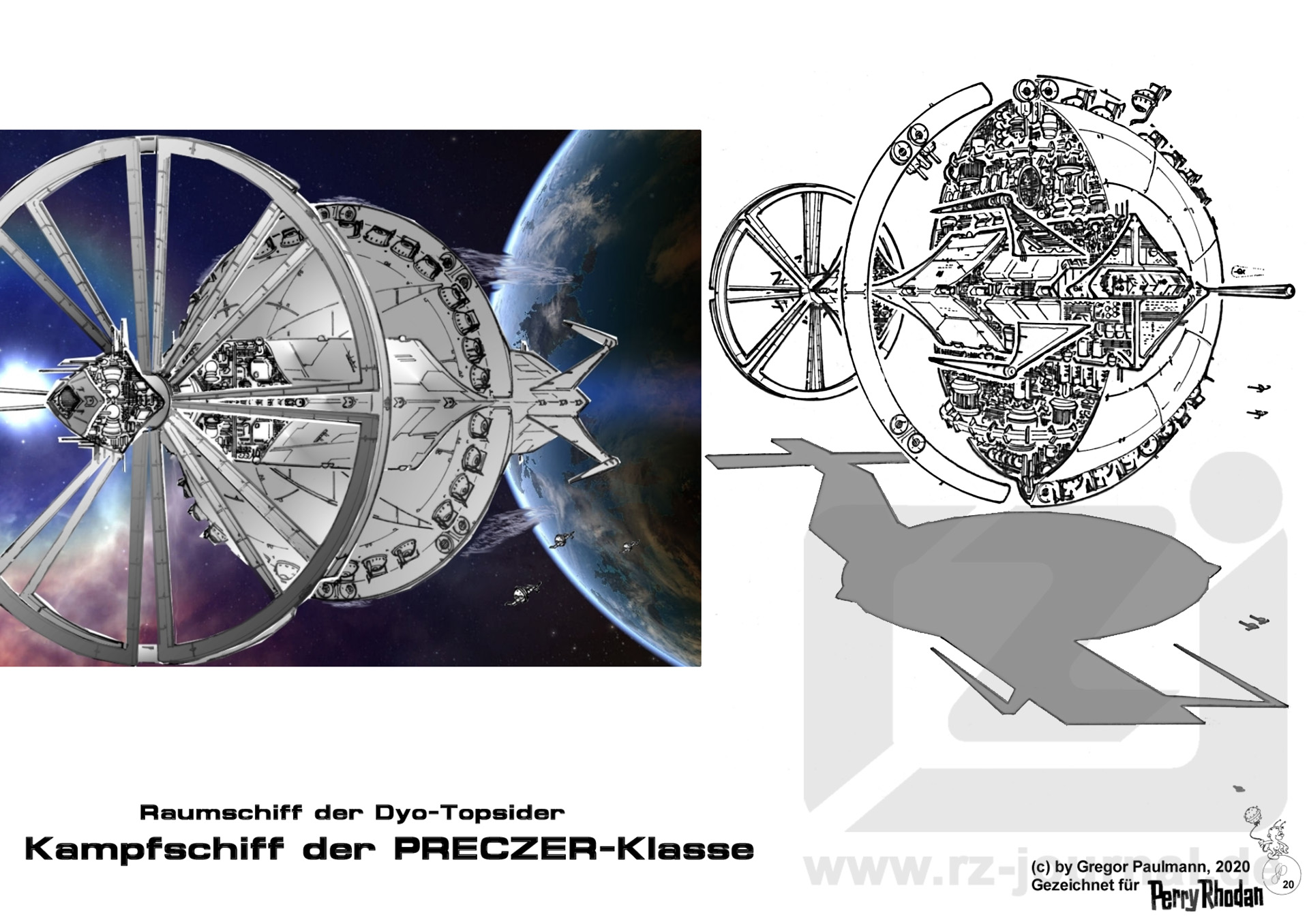 Die mit 2200 Metern Gesamtlänge und einem Kugeldurchmesser von 870 Metern sehr mächtigen Raumschiffe der PRECZER-Klasse bilden das Rückgrat der Raumflotte des Sternengeleges Topsid, das die Hegemonialmacht im Bereich des dyoversalen Zwillingsuniversums darstellt, in das Terra im Jahr 1614 NGZ versetzt wurde. Wie für die Dyo-Topsider typisch, verfolgt das Schiff einen asymmetrischen Aufbau mit einer Hauptkugelzelle und einem seitlich daran verlaufenden, keilförmigen Rumpf sowie Auslegern am Heck. Ein auffälliges Merkmal aller Großeinheiten der Dyo-Topsider sind die beiden gegenläufig rotierenden Linearkavitatoren im Bug, auf der Hauptachse der Kugelzelle. Die Abflugmasse beträgt im Schnitt 97,5 Millionen Tonnen. Die PRECZER-Klasse trägt 64 Groß-Beiboote und über 200 Klein-Beiboote und Shuttles. |