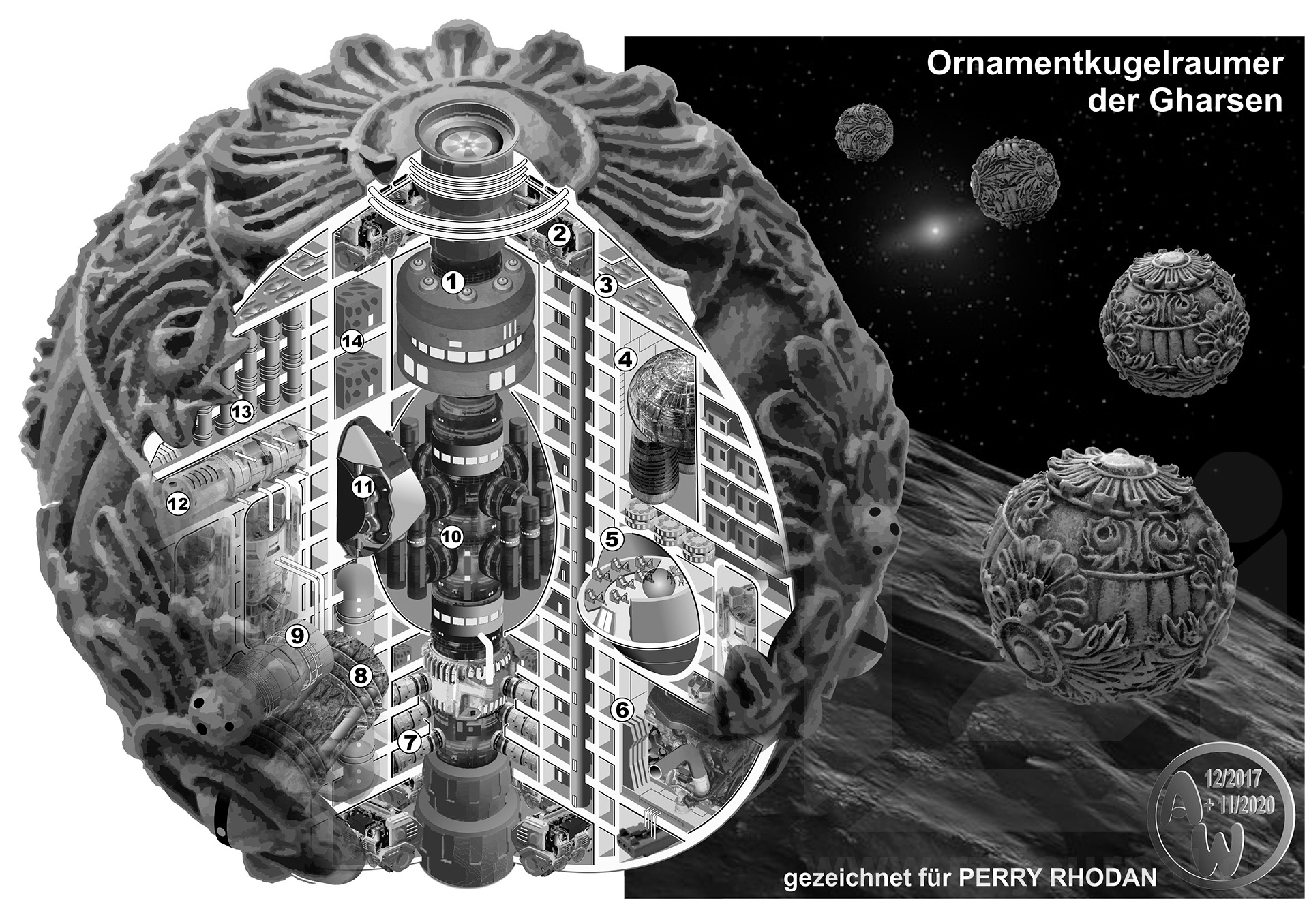 Gharsen sind entfernt humanoid und bis zu drei Meter groß. An Bord ihrer Schiffe ist allerdings alles noch über die sich dadurch ergebende Notwendigkeit hinaus ins Riesenhafte gesteigert. Raumhöhen von acht Metern selbst für normale Unterkünfte sind keine Seltenheit. Sofort augenfällig sind außerdem die aufwendig gestalteten Außenhüllen, in die das Para-Repulsive Profil (PRP) eingelagert ist, mit dem die Gharsen sich vor Psi-Begabten schützen. Die meisten Schiffe der Gharsen messen um die 1600 Meter im Durchmesser. Im Bild dargestellt ist eine kleinere 800-Meter-Einheit mit zumeist etwa 250 Besatzungsmitgliedern. Die kleineren Einheiten dienen eher als Aufklärer und sind nicht übermäßig stark bewaffnet, dafür sehr beschleunigungsstark. Schiffe von 1600 Metern Durchmesser tragen eine deutlich stärkere Bewaffnung, sind aber behäbiger zu manövrieren. Deutlich seltener kommen Einheiten mit mehr als 2000 Metern vor; sie dienen vorrangig als Träger. Eine weitere Besonderheit der gharsischen Schiffe sind die Galerien. Jedes Besatzungsmitglied hat eine eigene, in der es Trophäen sammelt. Dabei kann es sich auch um lebende Wesen handeln, die in sogenannten Dhosdrus gelagert werden, was am ehesten als Schauhaut zu übersetzen wäre. Es sieht aus, als wäre der Inhalt in einer leicht beweglichen Bernsteinmasse eingeschlossen. Der Dhosdru sorgt für das Überleben seines Gastes, erlaubt ihm jedoch keinen eigenen Bewegungsspielraum. Lediglich ferngesteuert können die Eingeschlossenen sich bewegen. Neben den persönlichen gibt es über das Schiff verteilt auch allgemeine Galerien, in denen sich alle Besatzungs-mitglieder vergnügen können. Als Zwischenlager hat das Schiff über 500 Sarkophage an Bord. Dort werden Gefangene gelagert, die noch nicht für die Galerien bestimmt sind oder von dort ausgelagert wurden, um die Ausstellung interessanter zu gestalten. |