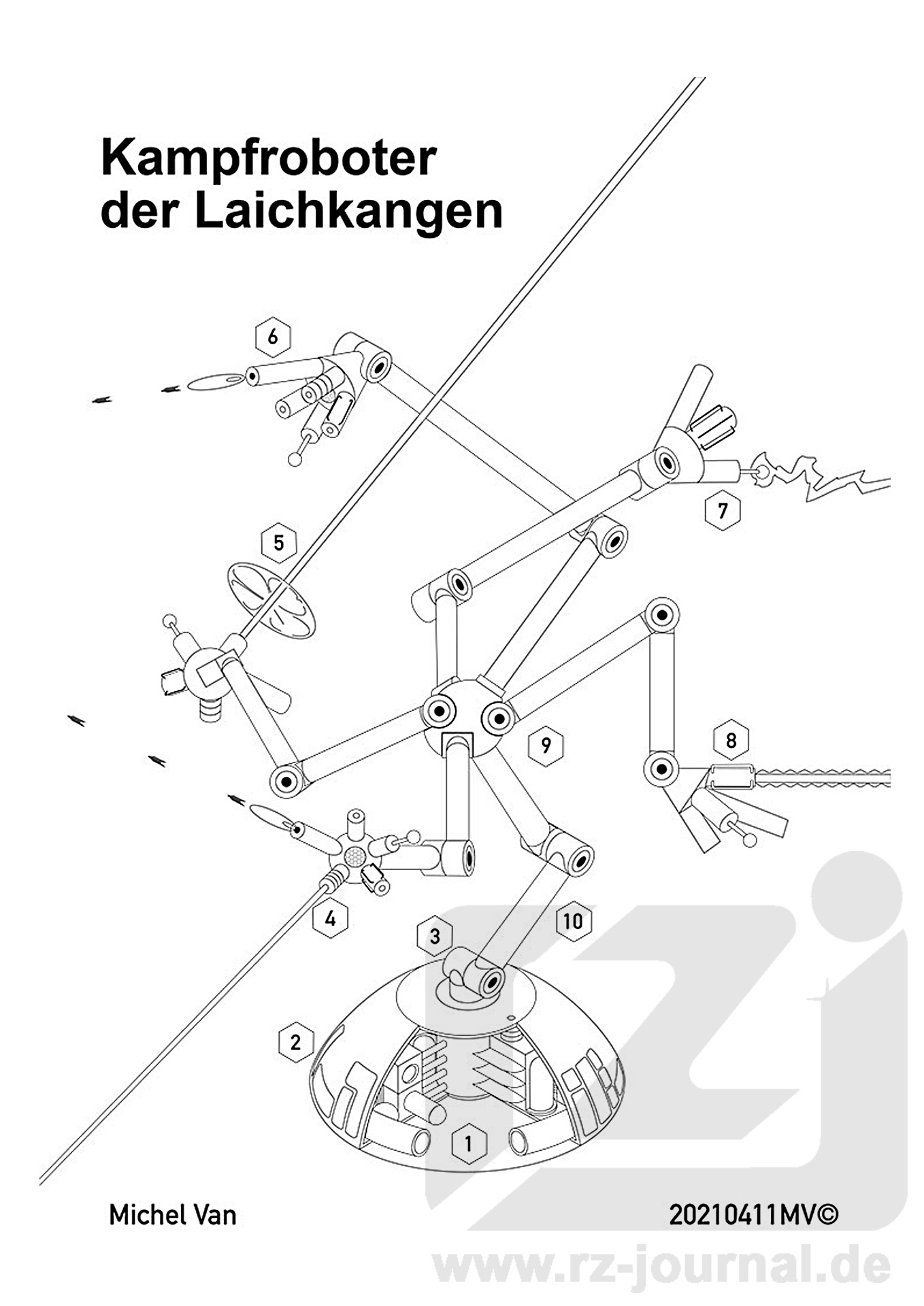 Die Laichkangen agieren als Hilfsvolk der Chaotarchen an Bord des Chaoporters FENERIK. Im Einsatz handeln sie zielstrebig, kalt, aber auch vorsichtig, bringen sich nicht in Gefahr und setzen ihre Materialien, insbesondere ihre Roboter, strategisch klug ein. Diese Roboter entstammen nicht dem chaotarchischen Technoparkett, sondern sind eine Eigenentwicklung der Laichkangen. Sie wirken auf den ersten Blick chaotisch, entpuppen sich jedoch bei näherer Betrachtung als durchdacht und in manchem auch unmittelbar der Lebenswelt der Laichkangen entnommen. So fußen die Roboter auf einem Sockel, der an einen Laichkangenfuß erinnert. Die Parallelität äußert sich in Form und Funktion: Der Sockel enthält sowohl die Antigravaggregate, die den Robotern ihre Mobilität verleihen, als auch die vielfältigen Sensoren, die ihnen erlauben, ihre Umgebung mit höchster Präzision zu erfassen. Eine Äquivalenz zu den ledrig-weichen Fußsohlen der Laichkangen, mit denen sie jede noch so feine Schwingung in ihrer Umgebung wahrnehmen. Die konischen Mündungshalterungen dagegen erinnern an laichkangische Hände, deren Finger in einem Konus zusammenlaufen, ehe sie über ein Gelenk in den Arm übergehen. Die Anzahl der Gelenke jedes Waffenarms entspricht der eines Laichkangenarmes wie auch dem eines Terraners. Dass es keine vier, sondern fünf Waffenmündungen in jeder Halterung sind, unterstreicht wiederum den Pragmatismus: Fünf Waffenarten sollten enthalten sein, also erhält jeder Waffenarm fünf »Finger«. Ebenso ist die Anzahl von fünf Anschlüssen für austauschbare Waffenarme am zentralen Kugelgelenk wohl schlicht der maximalen Ausreizung der Kapazität der Energieversorgung zuzuschreiben. Mit der Antigravlagerung und der extremen, dank Mikroinerter nicht durch Trägheitseffekte behinderten Beweglichkeit der Waffenarme in Verbindung mit der exzellenten Sensorik, können diese Roboter innerhalb von Sekundenbruchteilen jedes Ziel anvisieren und zerstören, wenn dieses nicht über ausreichenden Schutz verfügt. Die Vielzahl der unterstützten Waffen wiederum sorgt dafür, dass einem kombinierten Punktbeschuss kaum ein Schutz lange standhalten kann. Diese Kampfroboter stellen somit für Gegner auf dem technischen Niveau der Galaktiker eine äußerst ernst zu nehmende Gefahr dar. |