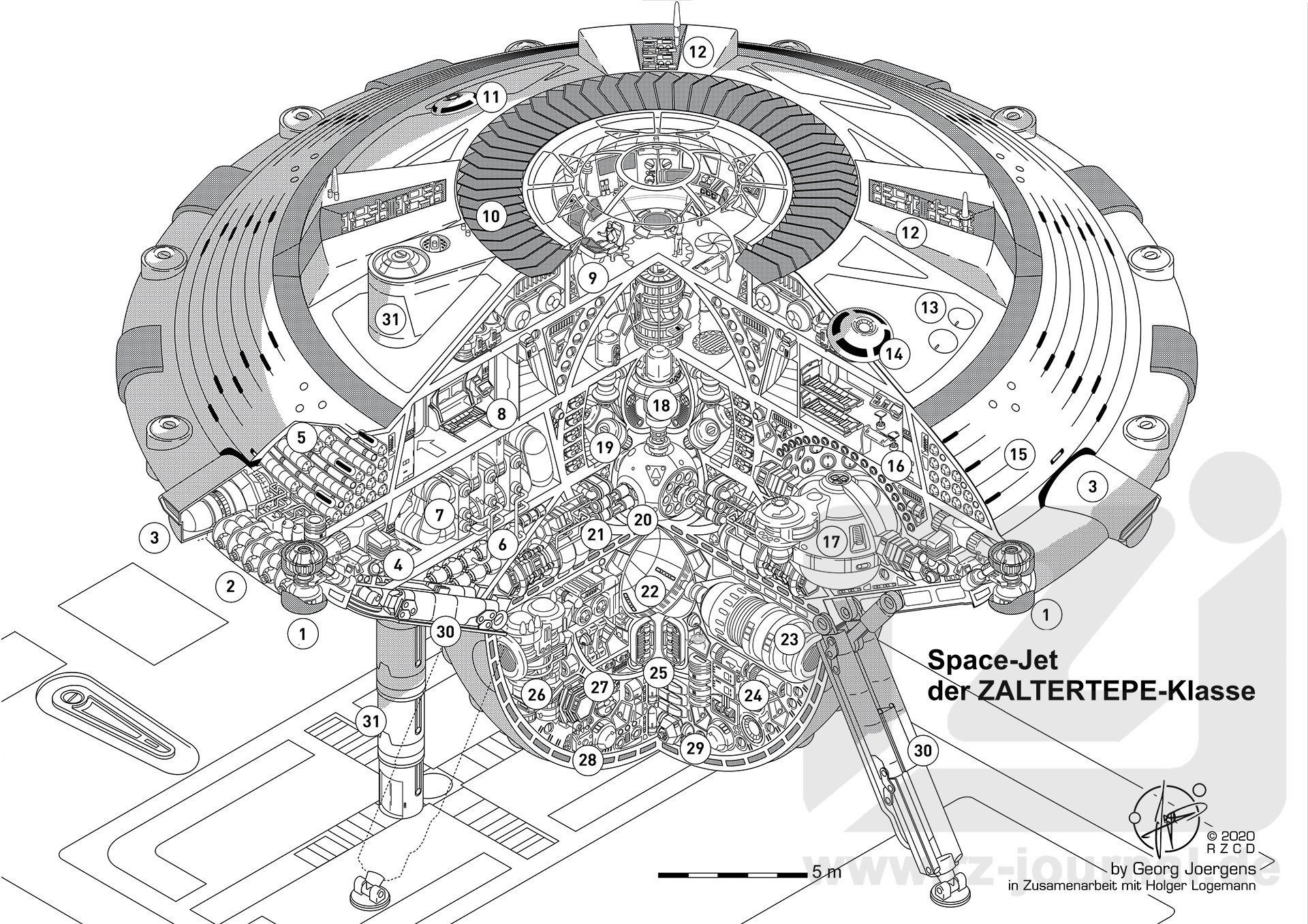 Die Space-Jet der ZALTERTEPE-Klasse ist ein Spezialraumer für Erkundung und verdeckten Einsatz. Sie basiert auf einer Grundzelle von 36 Metern Durchmesser mit 12 Metern maximaler Dicke, also etwas größer als die ROMULUS-Klasse, auf der die LAURIN-Jets basierten, deren Nachfolger sie ist. Eine halbkugelförmige Ausbuchtung an der Unterseite beinhaltet die Paratron-Technik, die im Vergleich zur LAURIN-Jet wesentlich kompakter und modular verteilter gebaut wurde und somit anstatt des Zylinders an der Unterseite fungiert. Zusätzlich zum weiterentwickelten LAURIN-Schutzsystem wurde das Schiff mit einer chromatovariablen Außenhüllenbeschichtung versehen.