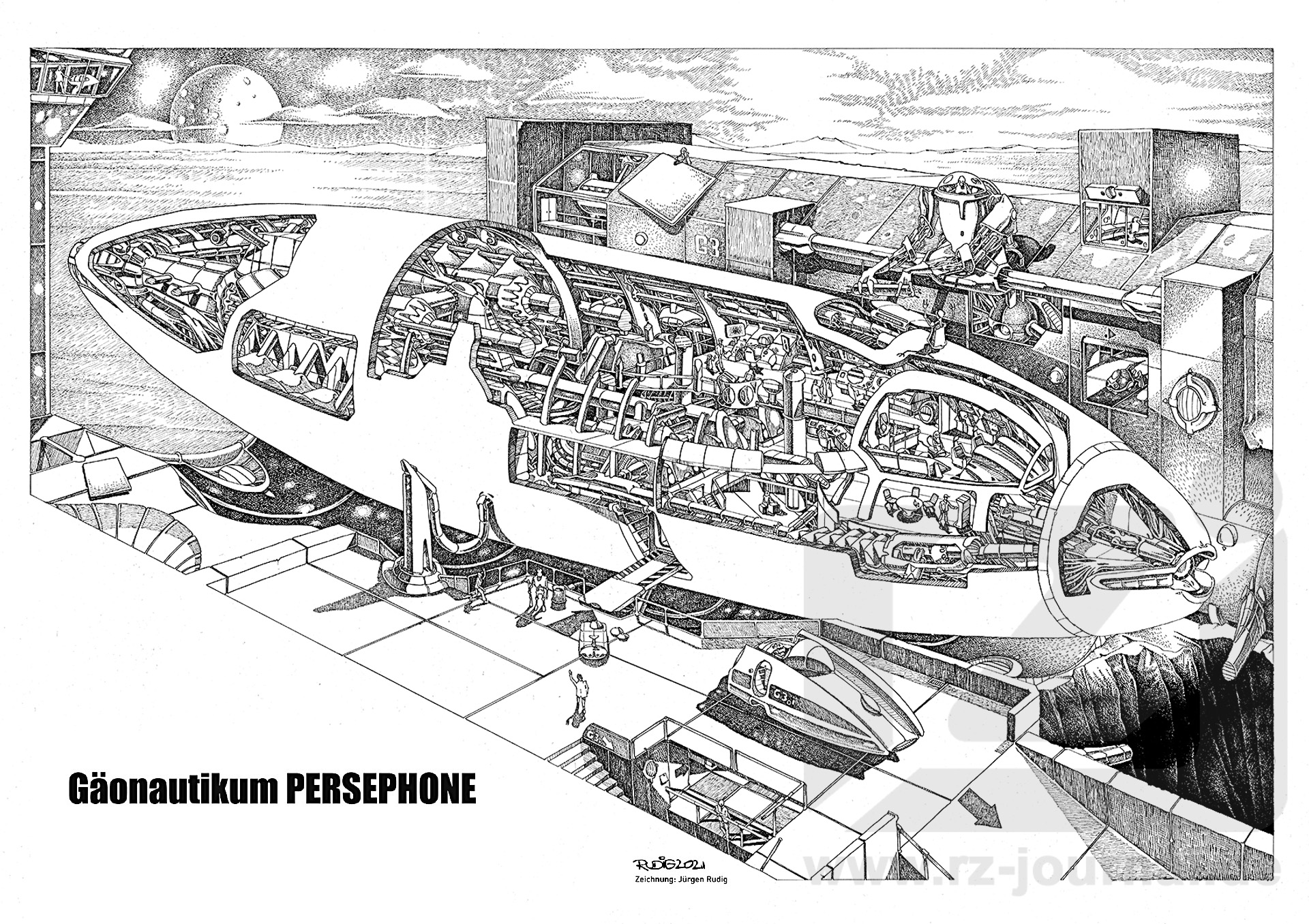 Technische Daten und Legende Gäonautikum: Länge: 80 Meter; Durchmesser: max. 20 Meter; Einsatzgewicht: 45.000 Tonnen; Durchdringungsgeschwindigkeit: 5 m/s; Besatzung: 2-4 Piloten, 8-10 Wissenschaftler