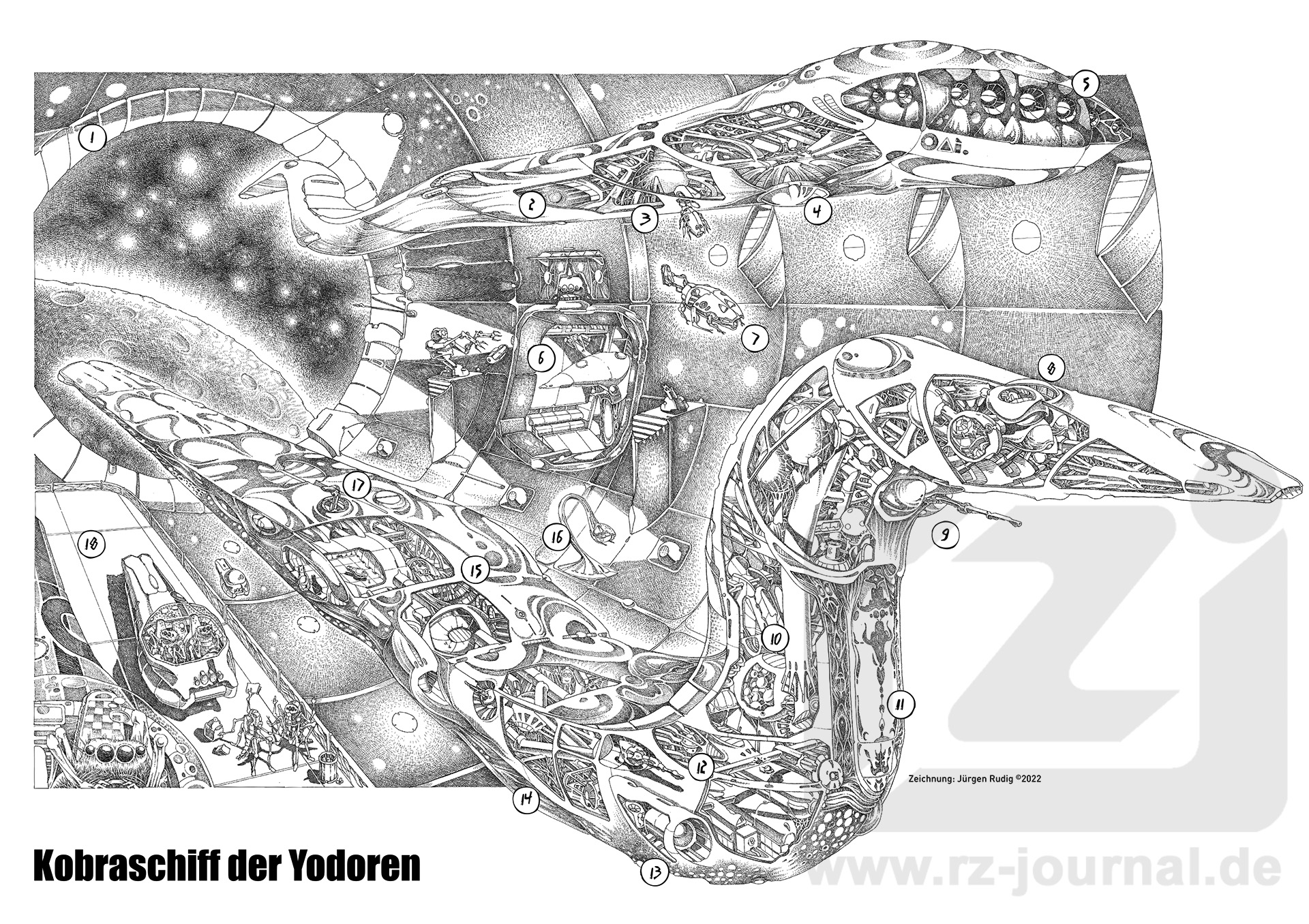 Die Yodoren zählen zu den Hilfsvölkern der Kosmokraten. Sie nutzen schlanke, im vorderen Teil nach oben gebogene Raumschiffe, deren Bug in einen lanzettförmigen Kommandoteil ausläuft. Insgesamt sind diese Schiffe in hohem Maß nach ästhetischen Gesichtspunkten ausgelegt, was sich auch an ihrem farbenfrohen Äußeren zeigt, das in der Gestaltung meist der aktuellen Mode der yodorischen Lamellenkleidung folgt. Wegen ihrer Form bezeichnen die Terraner die Raumschiffe auch als »Kobraschiffe«. Ihre Grundform ist dabei den Wohnhöhlen der Yodoren nachempfunden, in denen der Kopf einer geschützt am Ende der gewundenen Gänge liegenden Nesthöhle entspräche und die Lanzenform der Form eines Gelegekokons. Die hier bei der Wartung in einem yodorischen Raumdock gezeigten Ausführungen der Raumer sind an der Basis 1000 Meter lang bei einem Durchmesser von 100 Metern. Die Kommandoteile ragen 150 Meter vor, bei 25 Metern Höhe. Details über ihre technische Ausstattung sind – wie bei kosmokratischem Einfluss üblich – nicht bekannt; die bisher beobachteten Leistungsparameter liegen jedoch deutlich höher als der galaktische Schnitt. Charakteristisch für yodorische Raumschiffe ist vor allem das sogenannte Intermentum, das im pilzartigen Pyondurgeflecht beheimatet ist und es den Besatzungsmitgliedern ermöglicht, eigene Bewusstseinsinhalte anderen zugänglich zu machen. Das Alter des Intermentums bestimmt den Reifegrad eines Raumers und ist mitbestimmend beim taktischen Rang des Schiffes innerhalb der Flotte. |