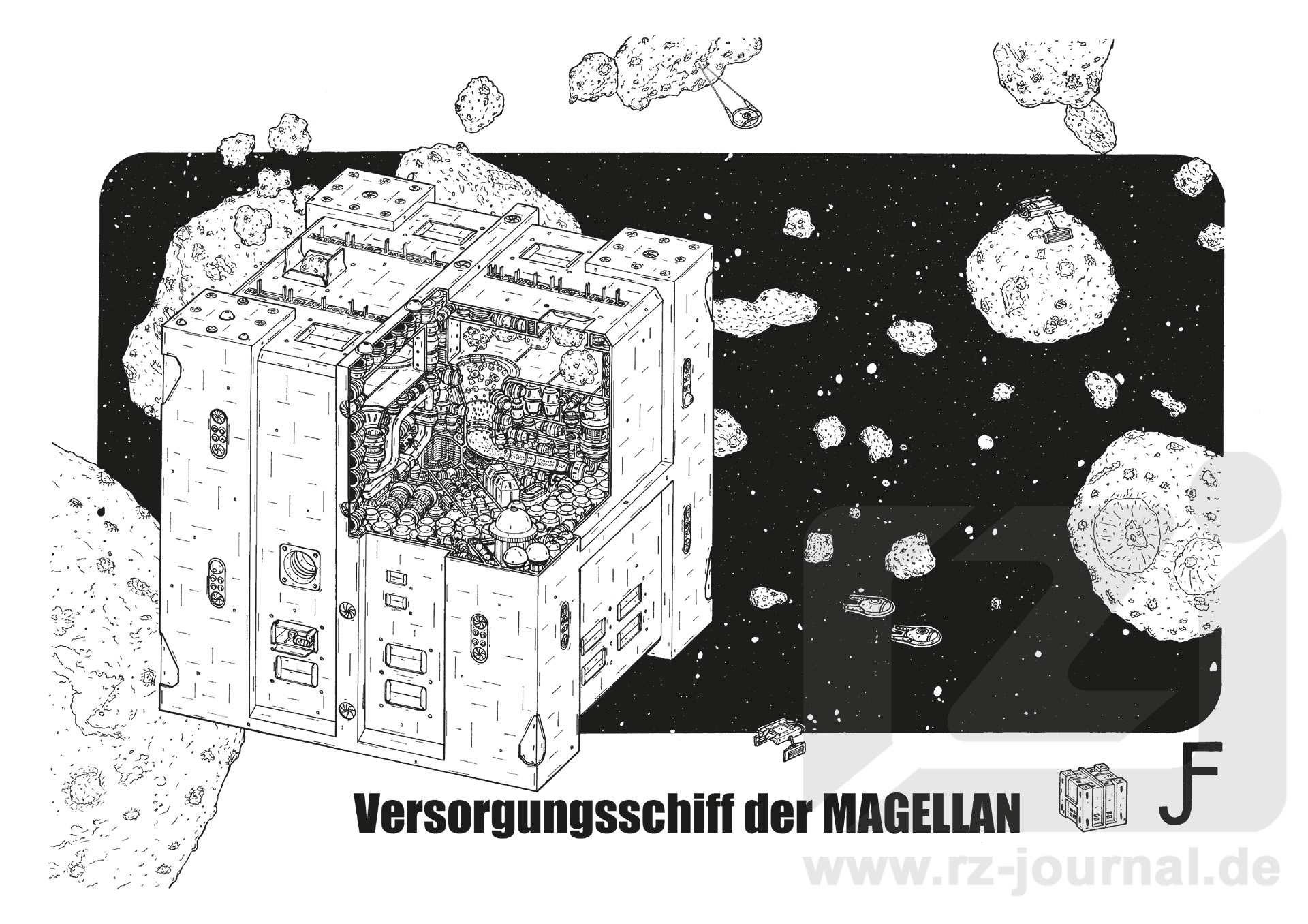 Allgemeines: Die MAGELLAN ist ein umgebauter Tender der ANDROMEDA-Klasse. Im Jahr 2085 NGZ ist er nach Gruelfin aufgebrochen, um als Vorposten und Versorgungsbasis für eine nachfolgende Expedition auf der Suche nach dem dortigen ES-Fragment zu dienen. Dafür verfügt sie ihrerseits über fünf Beiboote, um den Tender mit den notwendigen Rohstoffen zu versorgen (hauptsächlich Metallerze, Hyperkristalle, Kohlenstoff, Wasserstoff und Edelgase). Diese Versorger basieren auf BOXEN der RUDYN-Klasse (Würfel mit 500 Meter Kantenlänge). Zwei davon sind auf Gasgewinnung (TANKER-01 und -02), drei auf feste Stoffe spezialisiert (MINER-01 bis -03). Die Darstellung zeigt die MINER-03 in einem kleinem Asteroidenfeld. Der Versorger sammelt größere Asteroiden, zerschneidet sie mit Desintegratoren und extrahiert in internen Fabrikstraßen die wertvollen Rohstoffe. Jeder der drei MINER verfügt dafür über Lasten-Space-Jets und andere Beiboote, die Positronik-gesteuert allein agieren können |