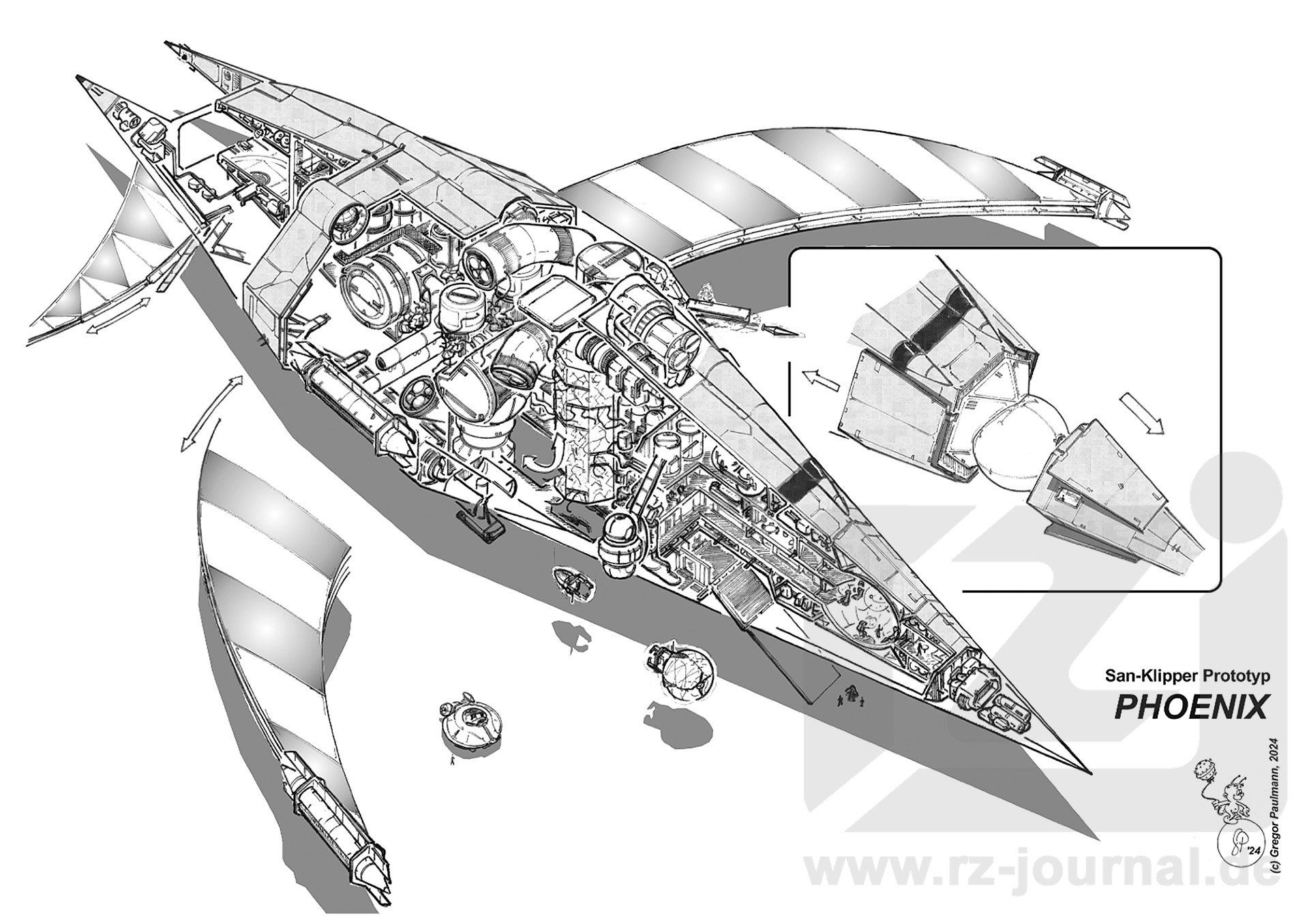 Allgemeines: Die Organisation San verfolgt die Vision, die Galaxien der Lokalen Gruppe wieder enger miteinander zu verknüpfen. Den Galaxien vorgelagerte San-Höfe sollen dabei als Drehscheiben dienen, die über einen regelmäßigen schnellen Raumschiffsverkehr miteinander verbunden werden. Der PHOENIX ist ein Prototyp der geplanten Verbindungsschiffe und wird auch als San-Klipper bezeichnet. Er ist auf den ausschließlichen Flug im intergalaktischen Raum mittels eines für Kleinraumschiffe optimierten Hyper- trans-Progressors ausgelegt, unter sparsamstem Umgang mit dem teuren und seltenen Salkrit durch Minimierung von Volumen und Masse. Daher wurde auch auf einen Linearantrieb verzichtet. Dargestellt ist der PHOENIX nach seinem Umbau für die im Juli 2245 NGZ von Shrell geforderte Fernexpedition. Dabei wurden die Möglichkeiten von Energieerzeugung und -Speicherung noch einmal signifikant erweitert. Außerdem wurde Platz für Shrells Zusatzaggregat und ein Beiboot geschaffen. Dabei reduzierte sich der restliche Platz so, dass unter zumutbaren Bedingungen nur maximal sechs Personen den Fernflug antreten konnten, und auch das nur, weil von vorneherein auf eine Zentrale verzichtet worden war. Technische Daten: Monocoque-Doppelpfeilrumpf mit sechseckigem Querschnitt aus Ynkonit-Il-Kompotaph, Länge 160 Meter, Breite 45 Meter, Höhe 29 Meter. Gesamtlänge PHOENIX mit ausgefahrenen Fluidblech-Projektorsegeln und Emitterspindeln 170 Meter bei einer Spannweite von 124 Metern. Masse mit voller Ausstattung 8250 Tonnen. Unterlichtbeschleunigung 0,2 Kilometer pro Sekundenquadrat (Gravopuls-Antrieb) zum zügigen Erreichen des freien Weltraums nach Start oder Ablegen. Überlichtfaktor San-HTP 350 bis 400 Millionen im intergalaktischen Raum, 2,5 Millionen innerhalb von Galaxien. |