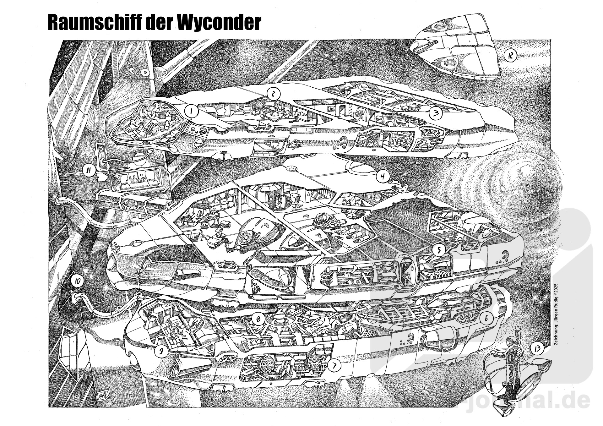 ln der Raumflotte der Wyconder zeigt sich einerseits deren hochstehende Technologie, andererseits aber auch der begrenzte Ressourcenzugang, weil das Wycosystem so abgelegen ist. Letzteres führte zu einem hohen Grad der Modularisierung und einsatzabhängigen Ausstattung. Die Basis sind dabei Kleinraumschiffe, die autonom flugfähig und in der Mitte teilbar sind. Die untere Hälfte enthält Antriebsmodule, die Energieversorgung sowie starke Mehrzweck-Feldprojektoren, die obere eine Steuerzentrale, die Lebenserhaltung einschließlich Schwerkraftkontrolle sowie frei nach Einsatzzweck ausstattbare Bereiche. Diese Grundeinheit ist mit einer terranischen Space-Jet vergleichbar. Zwischen die Hälften dieses Basismoduls können weitere Module eingeschoben werden, zum Beispiel Transportkomponenten, weitere Kabinenbereiche, Werkstatt- oder auch Gefechtseinheiten. Zusätzliche Antriebsmodule können die Transportkapazität erweitern, was insbesondere bei den Baustellenschiffen im Bereich Neu-Wengirs genutzt wird, um einzeln oder im Verbund große Asteroiden zu schleppen. Eine weitere Stärke der Bauform wird vor allem von Gefechtseinheiten genutzt: Die Basisschiffe können sich zu einer Art Dolde zusammenfinden, die zum Großteil aus Gefechtsmodulen besteht, welche alle mit einer zentralen Steuereinheit synchronisiert sind. Ein solches Konglomerat wird insgesamt ebenfalls als ein Schiff begriffen und weist eine hohe Anpassungsfähigkeit im Einsatz auf. Die Risszeichnung zeigt eine Koppelsituation in einem Raumdock. Zu sehen sind vier verschiedene Module, die gerade gekoppelt werden. Mithilfe von Fessel- und Traktorfeldern, die ein Raumdock projiziert, werden die Einzelteile zunächst in Position gebracht. Die Kopplung erfolgt anschließend zunächst mechanisch durch ausfahrbare Klammern und im Anschluss mittels Verschmelzungsfeldern, die der galaktischen Interkonnekt-Technik vergleichbar sind.