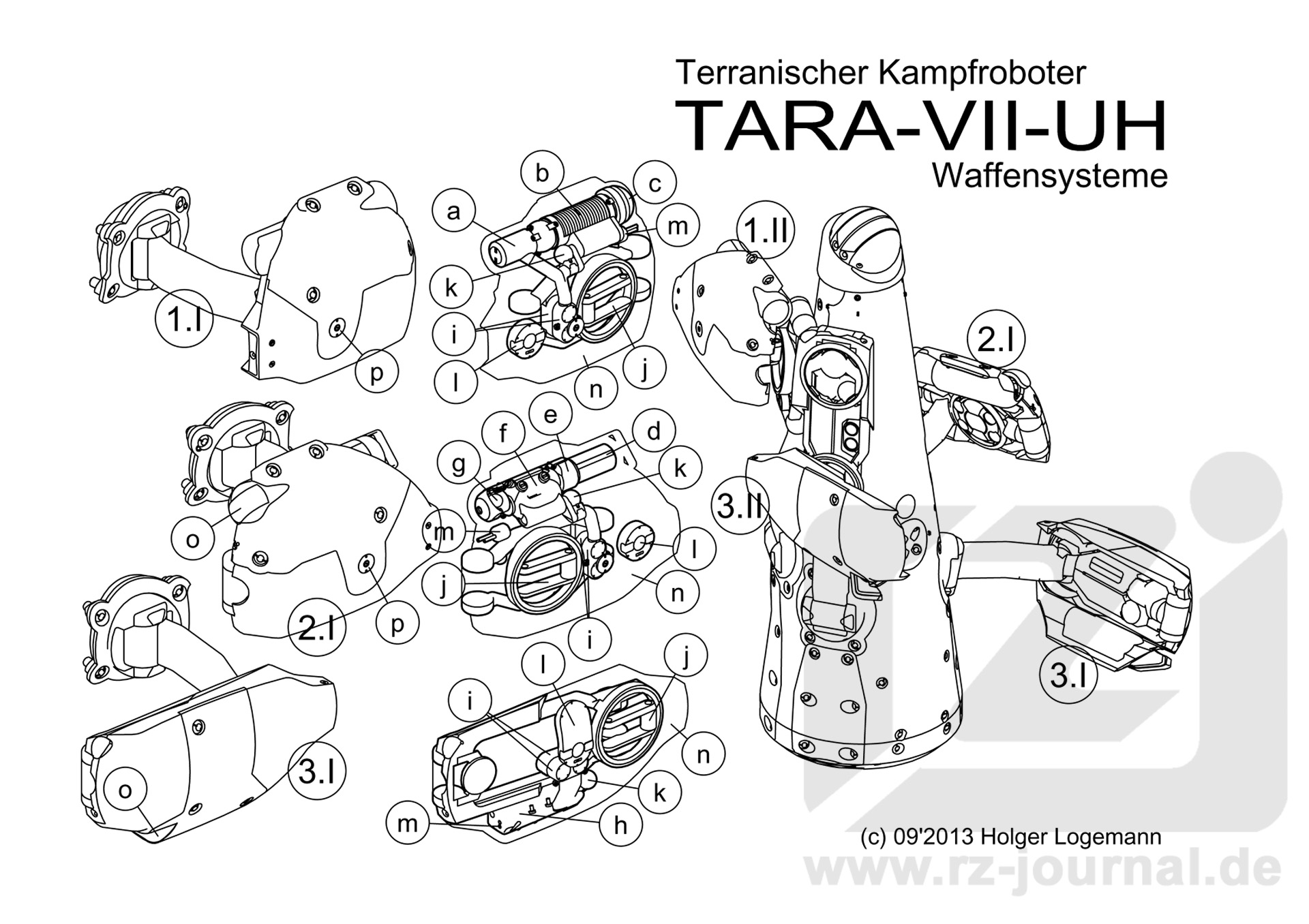 Peripheriesysteme i. Induktor-Einheitenpaar, trennt bei Konfiguration II die Verbindung zu den Rumpfsystemen j. Ausschwenk- und Rotationseinheit zur Einleitung der Waffenarm-Konfiguration II k. 60mm-Sphärotraf-Speicher l. autarke Waffenleit- und Systemkontrolleinheit m. Sensoren der Zielerfassungssysteme n. Ynkonit-LDE-Panzerung (Luurs-Derivate-Embedded) als Hocheffizienz-Kühlkörper o. Panzer-Verschlussklappen bei den Mündungen der Impuls- und Kombistrahler p. Holographischer Emitter, erzeugt bei Bedarf