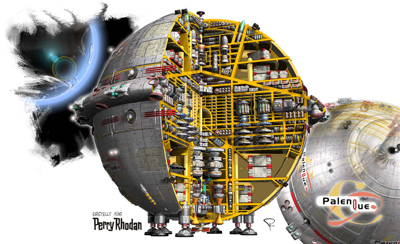 Die ursprüngliche Konzeption des 200 m Raumers PALENQUE beruhte auf einer Studie der LFT und sollte als Prototyp einer neuen Kugelraumer-Serie dienen. Zur Serienreife gelangte das Modell jedoch nicht, da die Mittel kurz nach Herstellung rigoros gestrichen wurden - das Vorserienmodell wurde kurzerhand an den Meistbietenden versteigert. Jetziger Eigentümer ist die GEMC »Galactic Explorers and Mining Company« bzw. ein Konsortium der GEMC und einiger anderer Firmen und Privatpersonen. |