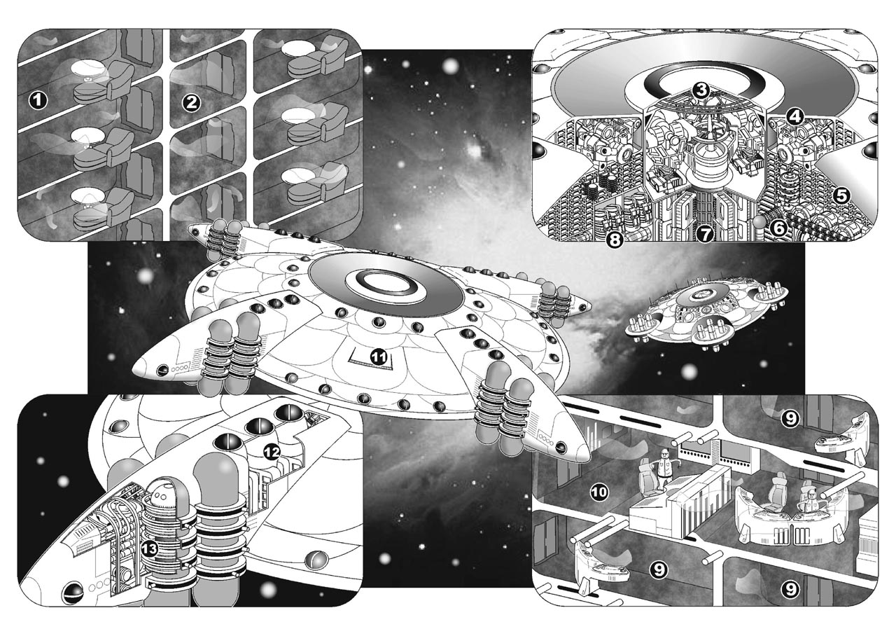 Allgemeines: Quochten erreichen zwischen 1,60 und 2,00 Metern Körpergröße. Ihr Kopf erinnert an irdische Frösche, ihr Oberkörper ist birnenförmig. Aufgrund ihrer Entstehungsgeschichte fürchten sie offene hohe Räume. Aus der Luft wurden sie früher von Flugechsen angegriffen, gegen die es fast keine Verteidigung gab. Als Raumschiffe nutzen die Quochten Blitzpaats von 311 Metern Durchmesser, die als Kurierschiffe eingesetzt werden und deren Gefechtswert durch bauliche Besonderheiten eingeschränkt ist. Daneben gibt es die Paateoms, ausgewogene Kreuzer mit 40 Bipuls und 16 Tripuls-Geschützen. Die Zeichnung zeigt in seinen Details einen schweren Kampfpaat, ein nahezu überarmiertes Schlachtschiff. Es führt 72 Tripuls- und 96 Bipulsgeschütze. Mit 933 Metern Durchmesser erinnert das Schiff von oben betrachtet an einen pockenübersäten Rundstern. Die Höhe des Schiffes beträgt 117 Meter. Bis zu 750 Quochten bedienen das Schiff, weitere 500 können als Landungstruppen an Bord genommen werden. Das Innere des Kampfpaats ist, ähnlich wie bei den beiden anderen Typen, höhlenartig angelegt. Lediglich die reinen Maschinenbereiche unterscheiden sich davon. Quochten bevorzugen zudem eine hohe Luftfeuchtigkeit, weshalb in ihren Wohn- und Arbeitsbereichen stets kleine Dampfwolken schweben und es dort von den Decken tropft. Selbst die Brücke macht da keine Ausnahme. Das Überlichttriebwerk des Schiffes kann modular komplett ausgetauscht werden. 24 schwere Energiespeicher ermöglichen große Reichweiten und starke Offensiv- und Defensivwerte. |